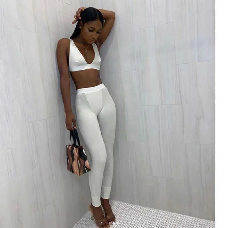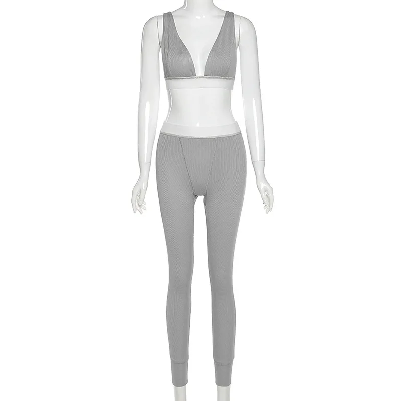 Женский трикотажный спортивный костюм в рубчик для фитнеса, летняя сексуальная одежда для отдыха с v-образным вырезом и открытой спиной, укороченный топ с тренировочными штанами, комплект из двух предметов для бега, Femme