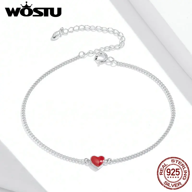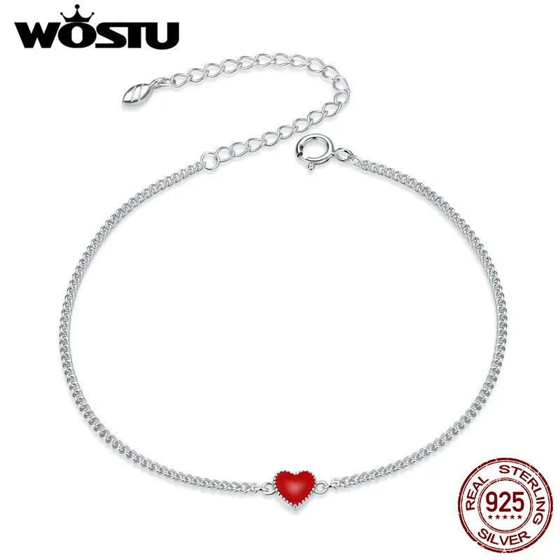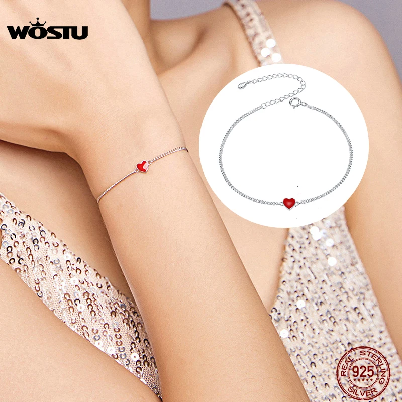 Женский браслет с сердечками WOSTU, браслет из 100% стерлингового серебра 925 пробы с цепочкой и красным сердечком, романтическое ювелирное изделие в подарок, CQB182