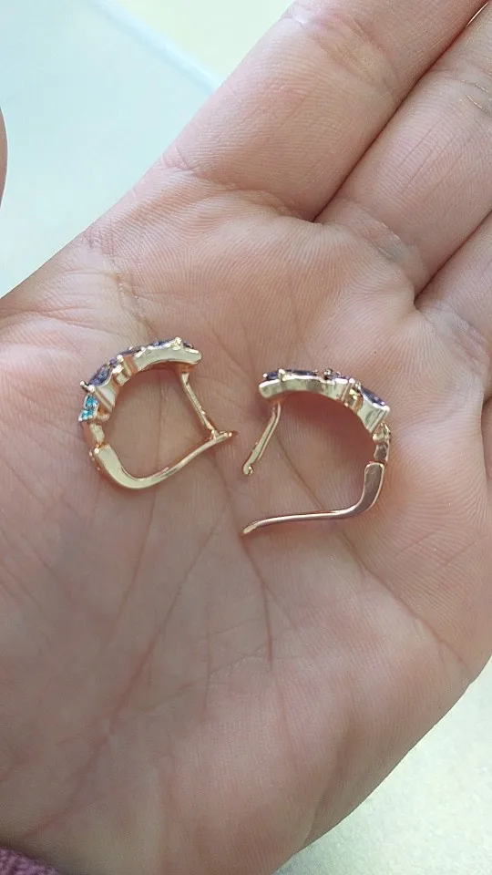 Доставка из Китая в РФ заняла примерно 3 недели. Товар соответствует фотографии продавца. Желтый цвет металла близок к цвету золота. Серьги сделаны аккуратно, но застежка слабая. Камушки оказались более бледные, чем я ожидала. The clasp is very weak.