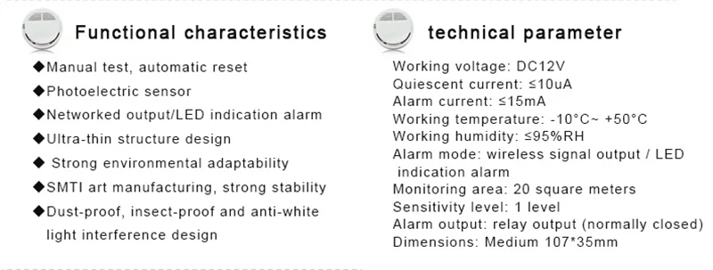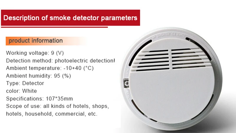 Громкость сигнала тревоги: от 10 футов до 85 дБКруглый размер: R = 102 мм, H = 31 ммПитание от аккумулятора 9 В (не входит в комплект)Использование: огонь, дымНомер модели: family guard
