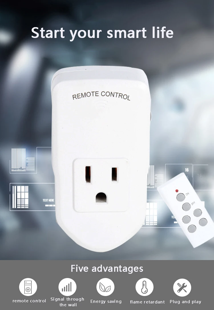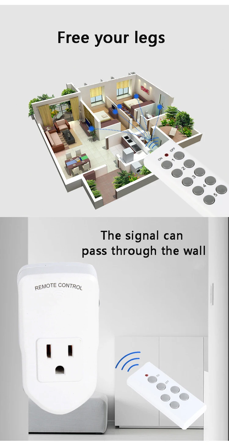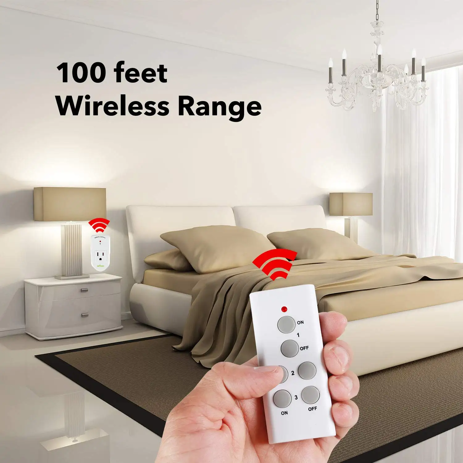 Выход внутреннего беспроводного пульта дистанционного управления включает и выключает приборы до 100 футов. Управляйте бытовой техникой со стороны комнаты или другой области вашего дома, используя один пульт дистанционного управления. Сигнал от пульта ДУ проходит через стены, окна или двери. Используйте удаленные розетки в одной комнате или нескольких местах; Полезно для людей с ограниченными возможностями и тех, кто просто хочет одним касанием, удобный способ включения и выключения освещения или приборов.