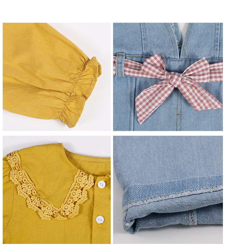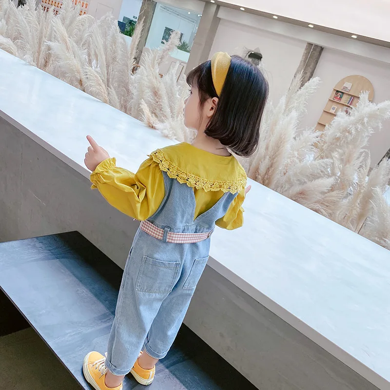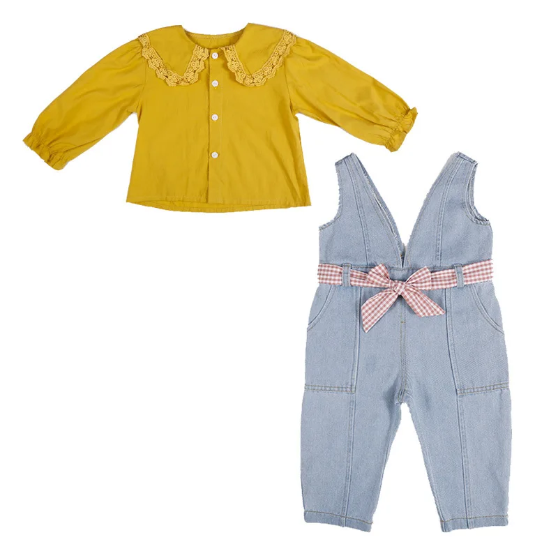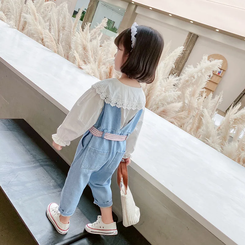Комплект детской одежды, кружевная рубашка для девочек + джинсовый комбинезон + пояс, 3 шт.компл., детская одежда, 2 цвета