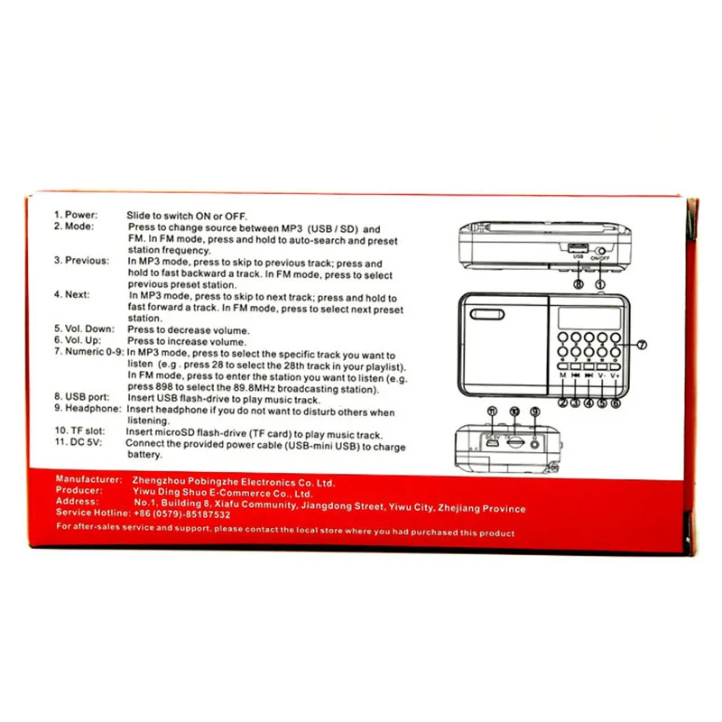 Посылка входит:1 x портативное радио1 x аккумулятор 186501 x USB-кабель для зарядкиСпецификация:Цвет: красныйВыходная мощность: 3 ВтTHD: ≤ 5%Динамик: 57 мм 3ΩЧастотный диапазон: 240 Гц-15 кГцFM-частота: 70 МГц-108 МГцВходная мощность: 5 В постоянного тока 0,5 ААккумулятор: 18650 3,7 в/1200 мАчОсобенности:-Супер громкий несмотря на небольшой размер.-Проигрывает до 8000 песен в формате MP3.-Прост в использовании.-Питание: слайд для включения или выключения.-Режим: Нажмите для изменения источника между MP3(USB/SD) и FM. В режиме FM нажмите и удерживайте для автопоиска и предустановленной частоты станции.-Предыдущий: в режиме MP3 нажмите, чтобы перейти к предыдущему треку, нажмите и удерживайте, чтобы быстро назад трек. В режиме FM нажмите для выбора предыдущей предустановленной станции.-Далее: в режиме MP3 нажмите, чтобы перейти к следующему треку, нажмите и удерживайте, чтобы быстро переслать трек. В режиме FM нажмите для выбора следующей предустановленной станции.-Объем. Вниз: Нажмите, чтобы уменьшить громкость.-Объем. Вверх: Нажмите для увеличения объема.-Цифра 0-9: в режиме MP3 нажмите, чтобы выбрать конкретный трек, который вы хотите прослушать (например, нажмите 28, чтобы выбрать 28-й трек в вашем плейлисте). В режиме FM нажмите, чтобы войти на станцию, которую вы хотите прослушать (например, Нажмите 898, чтобы выбрать вещательную станцию 89,8 МГц).-USB-порт: Вставьте USB-флешку для воспроизведения музыкального трека.-Наушники: Вставьте наушники, если вы не хотите беспокоить окружающих при прослушивании.-Слот TF: вставьте флеш-накопитель microSD (TFcard) для воспроизведения музыкального трека.-DC 5V: Подключите прилагаемый кабель питания (USB-mini USB) для зарядки аккумулятора.