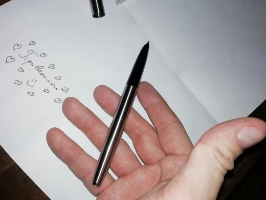 Посылка пришла за 11 дней. Все в хорошем состоянии. Авторучка целая, повреждений нет. Так же в посылке еще были картриджи от этого продавца. Все картриджи так же целые, ни один не протек. Ручка пишет тонко и легко. Но нужно приноровиться к ней. Единственным минусом считаю только то, что ручка легкая. До этого имел опыт использования ручки Jinhao x450, она потяжелее и перо там толще пишет, что не всегда удобно при оформлении документов. Jinhao 911 я заказывал именно по-тому, чтобы у меня была ручка, которая пишет тонко. Ну и помимо этого, очень привлек дизайн ручки со скрытым пером. Ручка очень напомнила старую советскую АР-95.