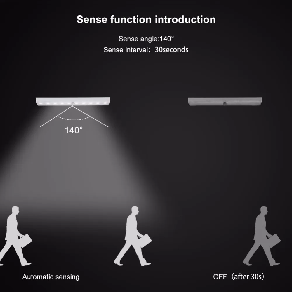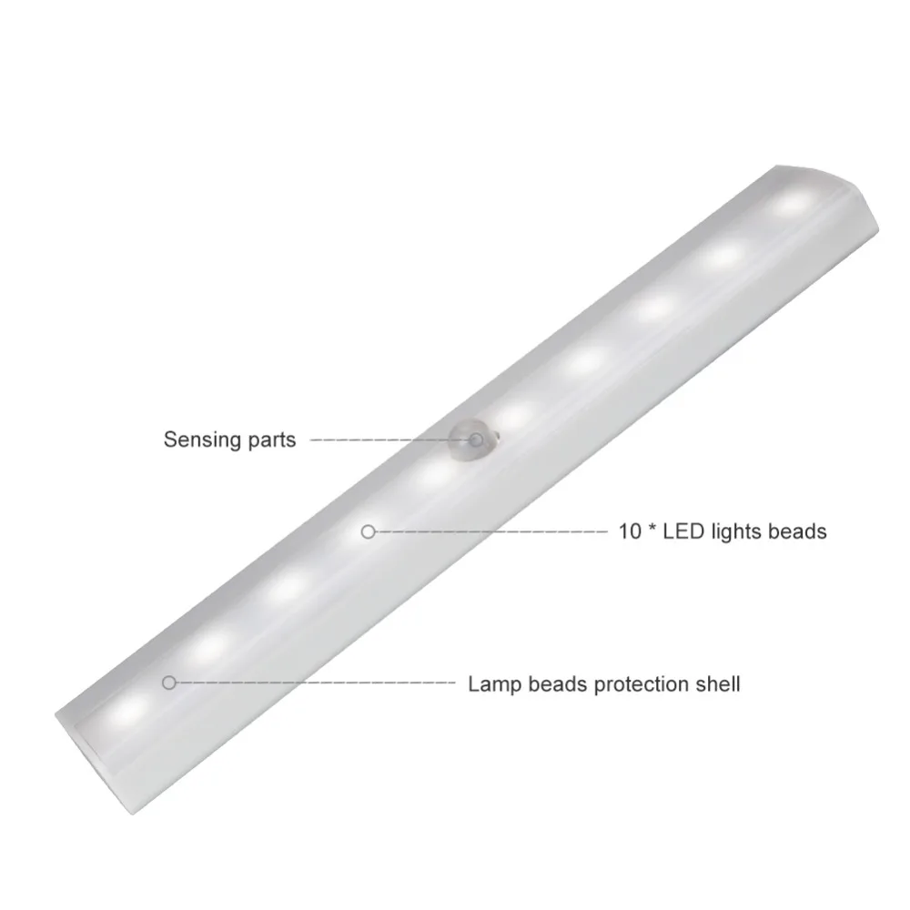 Питание от 4 батарей AAA (не входят в комплект). Освещение 10 шт супер яркие чисто белые светодиоды, низкое энергопотребление, энергосберегающие и экологически чистые. Светодиодный срок службы может составлять до 100000 или больше. Простая установка, 3 м клейкая лента, можно повесить и беспроводной инфракрасный датчик, который крепится без инструментов, болтов и гаек требуется при установке. Подходит для лестниц, ящиков, подножек, кладовки, спальни, гардероба, мастерской, книжной полки, чердака, шкафа, подвала, прихожей, коридора, изголовья, освещения багажника и т. д. Угол движения: 120 ° Вес: 51 г Предостережения 1. Никогда не устанавливайте этот светильник в влажном месте с высокой температурой, что может повлиять на нормальную работу светильник. 2. Никогда не устанавливайте светильник в сильный светильник в чехол влияет на чувствительность или отключение. 3. При затемнении светодиодный, пожалуйста, замените аккумулятор