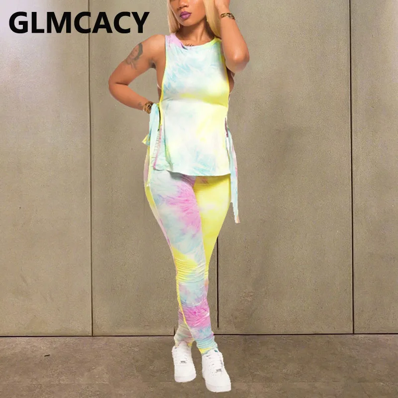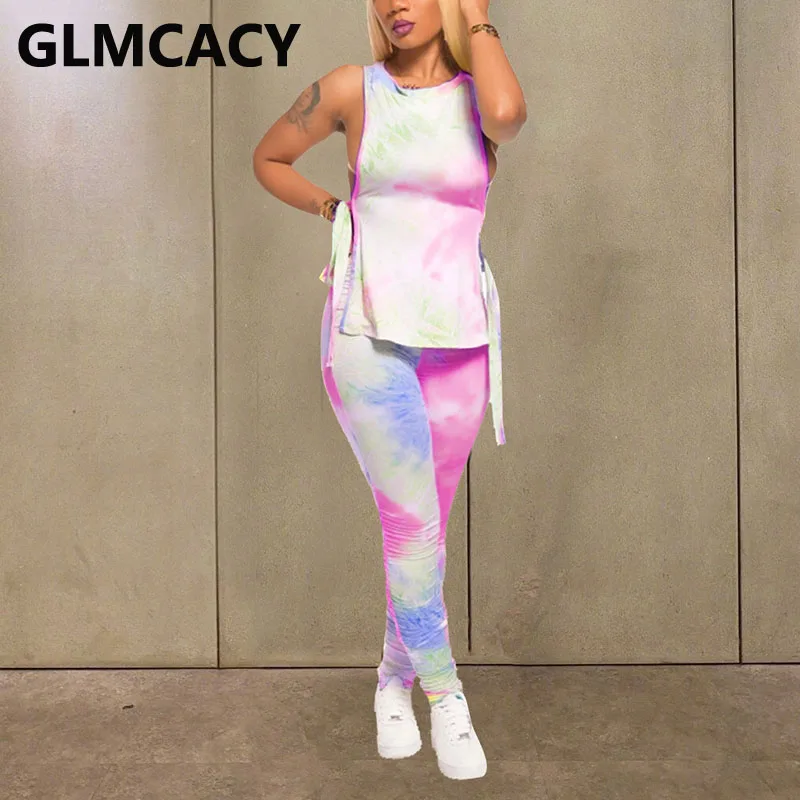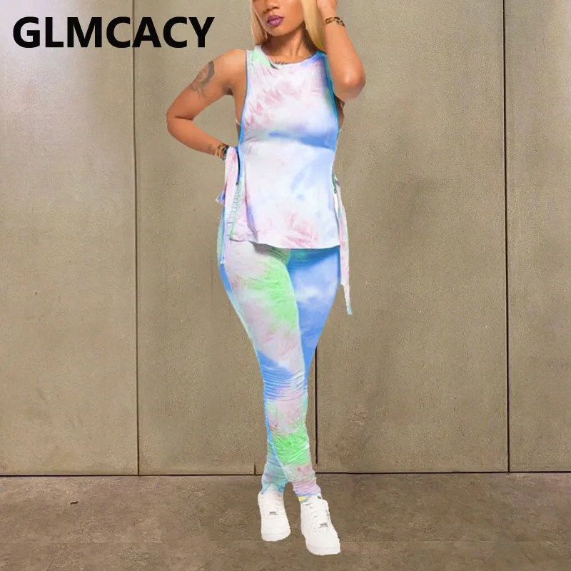 Женский комплект с абстрактным принтом, топ на бретелях с завязками сбоку и обтягивающие штаны, летняя повседневная Уличная одежда из двух предметов