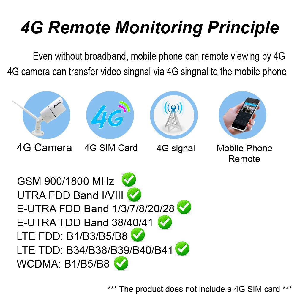 Даже без широкополосной связи, возможность удаленного просмотра на мобильный телефон с помощью 4G 4G камера может передавать видео через 4G singnal на мобильный телефон Поддержка GSM 900/1800 МГц UTRA FDD диапазон I/VIII E-UTRA FDD диапазон 1/3/7/8/20/28 Ремешок E-UTRA TDD 38/40/41 LTE FDD: B1/B3/B5/B8 LTE TDD: B34/B38/B39/B40/B41 WCDMA: B1/B5/B8 GSM: 900/1800 МГц