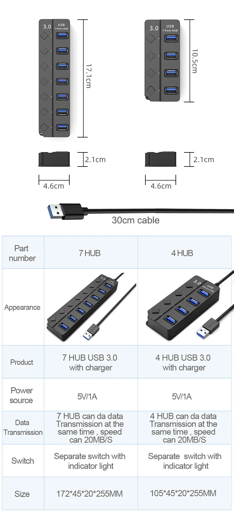 Портативный и удобный для путешествий, 7 портов размеры 171*46*21 мм, 30 см кабель, Вес нетто: 100 г.4 порта Размеры 105*46*21 мм, 30 см кабель, Вес нетто: 70 г