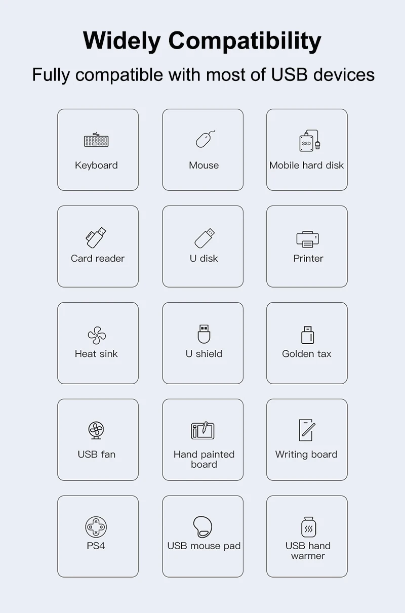 Полностью совместим с большинством usb-устройств, клавиатурой, мышью, u-диском, камерой, usb-гарнитурой, принтером, usb-кабелем, микрофоном, игровыми машинами, usb-вентилятором, компьютером, ноутбуком и т. д.