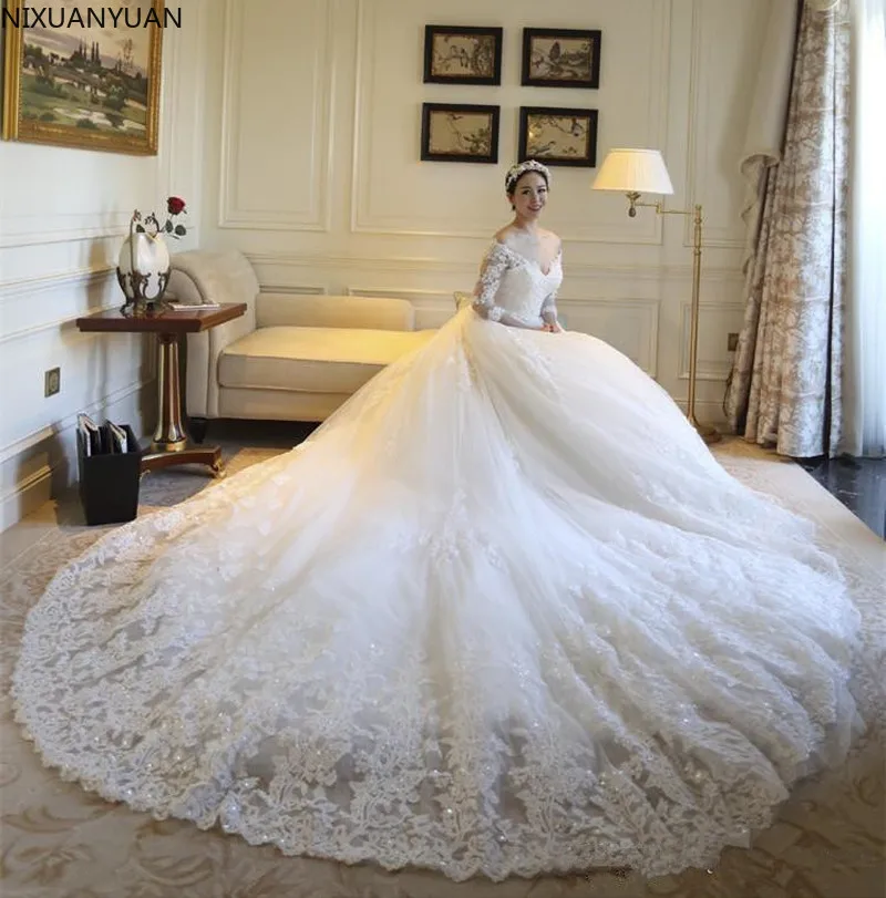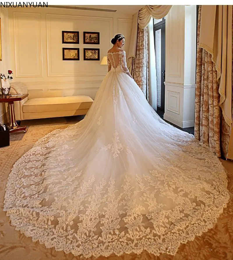 Кружевное бальное платье со шлейфом, свадебное платье с рукавами, 2021