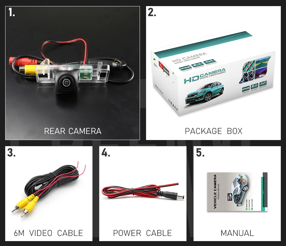 1. Задняя камера2 посылка3. Видеокабель (6 м)4. Кабель питания5. Руководство