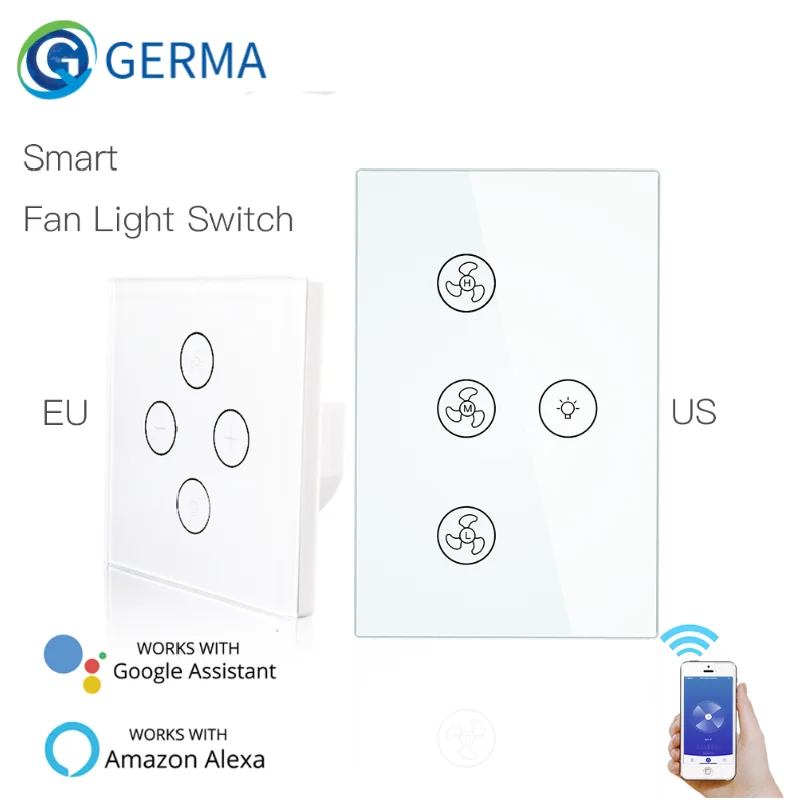 Умный вентилятор GERMA Wi-FiСветПереключательМожет управлять вентилятором и светом отдельно в любое время из любого места,БеспроводнойLy через использованиеИмеющиеся у вас домаСеть Wi-Fi. Не требуется концентратор, более удобный и простой в использованииЗамените традиционные переключатели напрямую. Чехол для мобильного телефона«Умная жизнь приложениеУправление и сенсорное управление доступны.