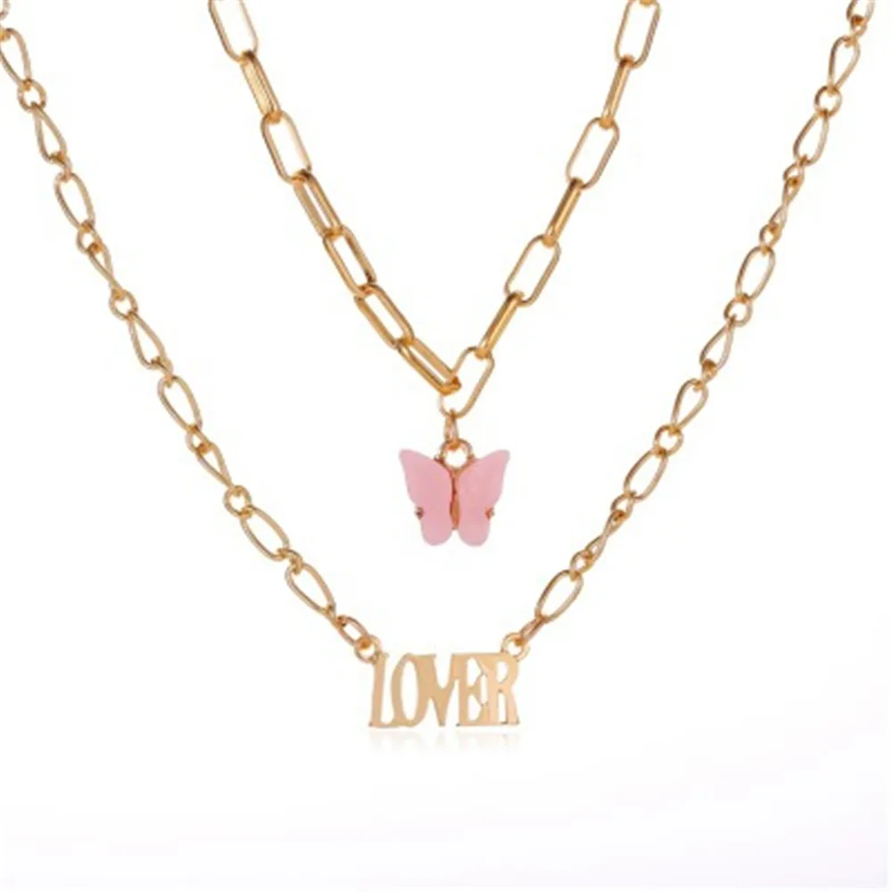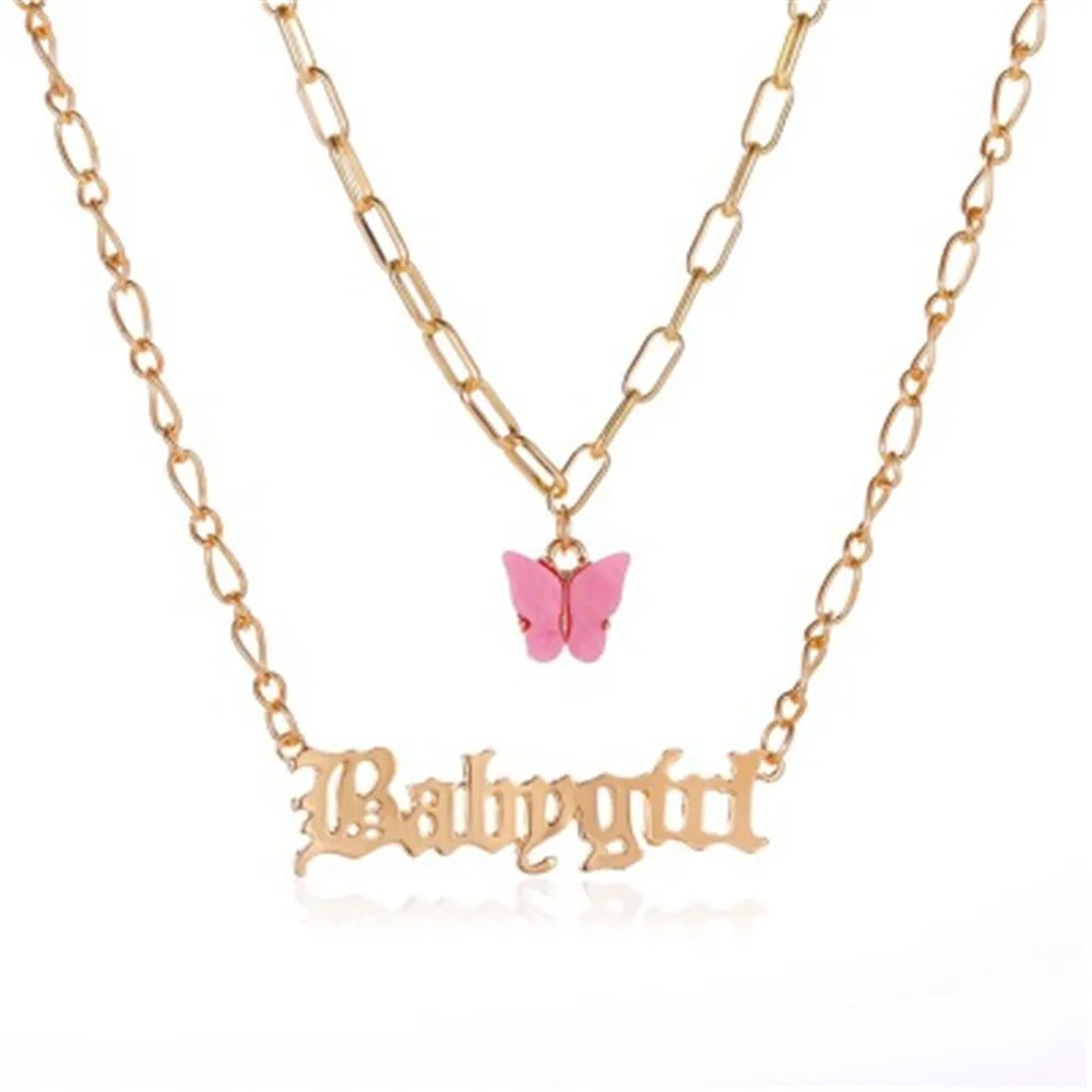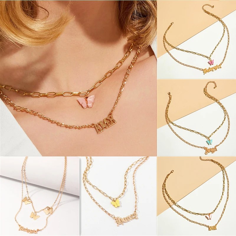 QIAMNI модное многослойное ожерелье для девочек с акриловой бабочкой, Двухслойное, с буквенным принтом, с алфавитом, для девочек