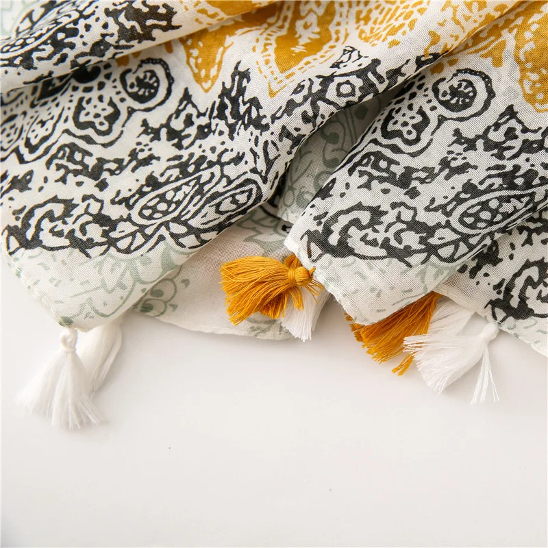 Новое поступление 2020, хлопковый шарф с Дамасским цветочным принтом и кисточкой, женские летние тонкие длинные шелковые шарфы, Женский хиджаб, Пляжная накидка