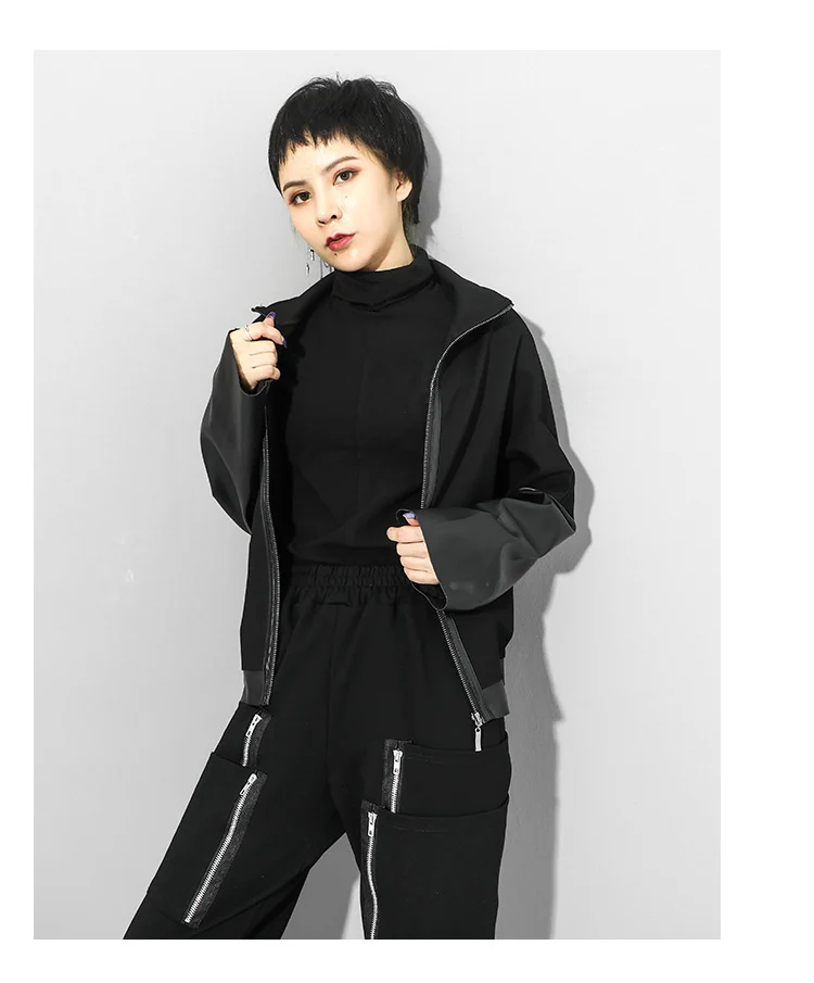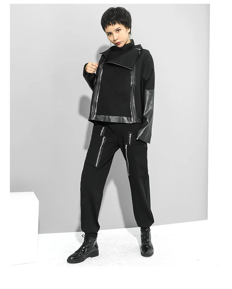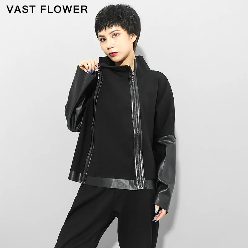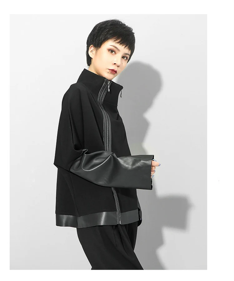 Женская куртка из искусственной кожи, составного кроя, черная Свободная куртка на молнии, винтажная одежда, кардиган, Осень-зима 2021