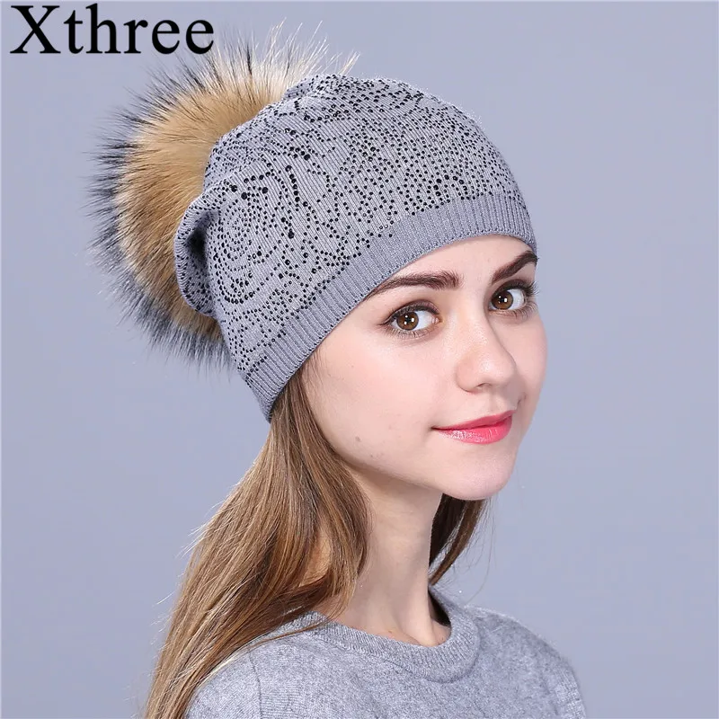 Xthree, новинка зимняя женская шапка, шерстяная вязаная шапка для девочек, шапка с помпоном из натурального меха, женская шапка