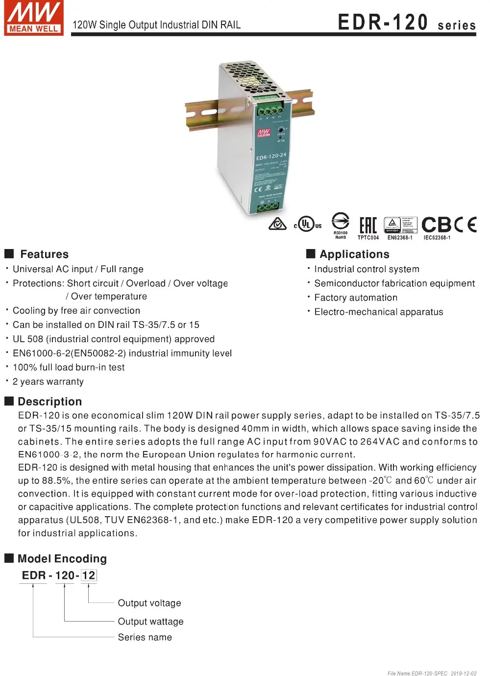 Mean Well EDR-120-24 meanwell 24V DC 5A 120W Промышленный источник ...