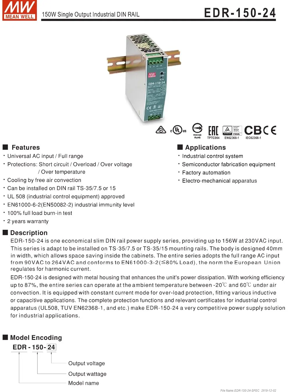 Бренд Mean Well представляет EDR-75 EDR-120 EDR-150 один Выход din-рейку импульсный Питание 12V 24V 48V meanwell светодиодный драйвер