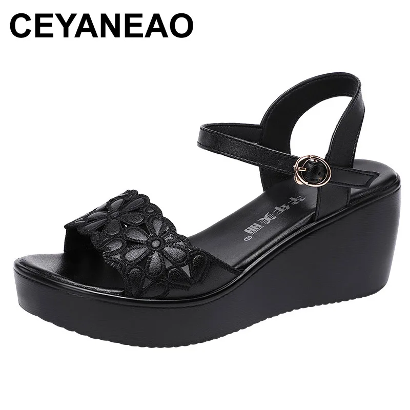 Женские босоножки на танкетке CEYANEAO, черные босоножки с цветами, с вырезами, на лето, 2020