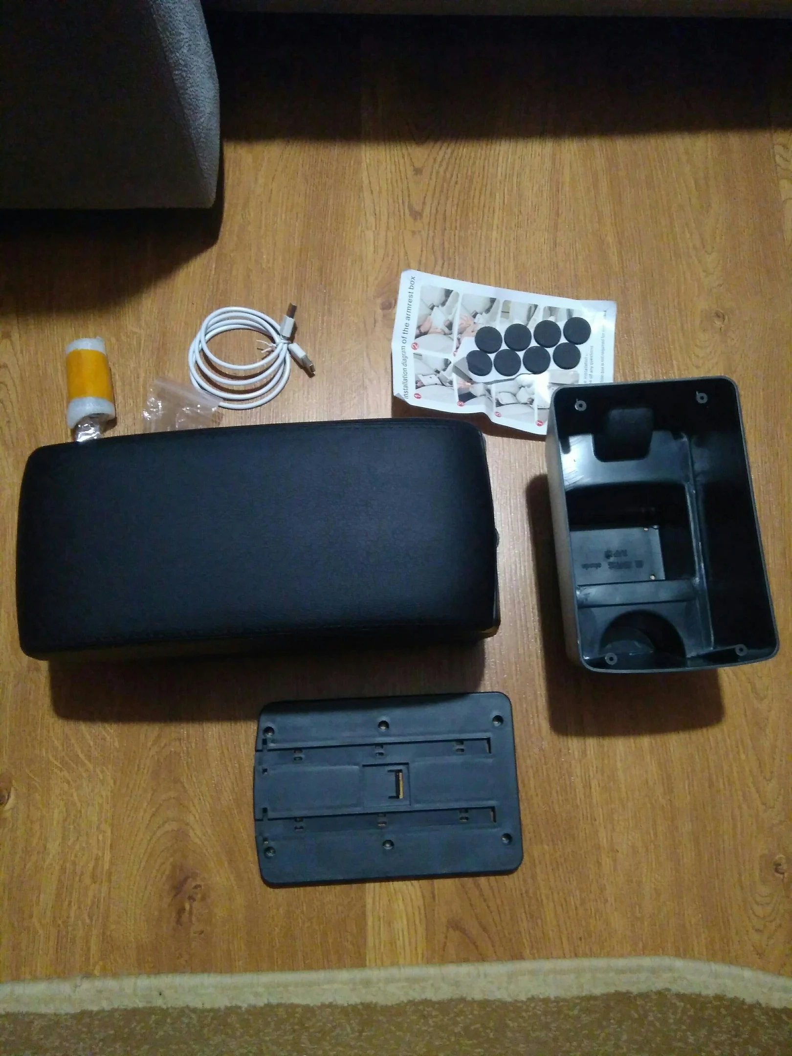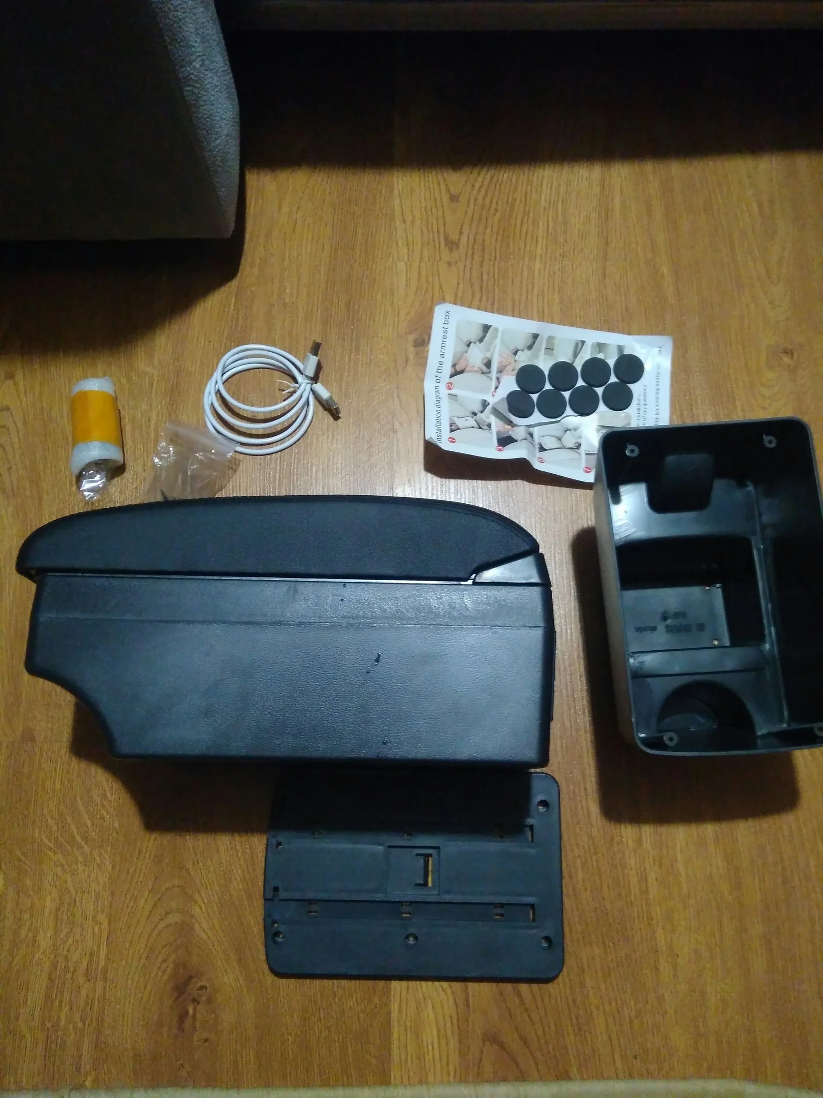 Доставка - 14 дней. Упаковка великолепная. Качество изделия очень приличное, прошито довольно аккуратно, вот только запах (надеюсь выветрится)... В комплекте: основание, подлокотник (3 USB), адаптер в прикуриватель на 2 USB (2.1A), кабель, мягкие уплотнительные прокладки, набор саморезов и инструкция. Вот только установить пока не получится - брал знакомой в подарок, а день рождения только через месяц. Но, думаю, проблем не будет.
