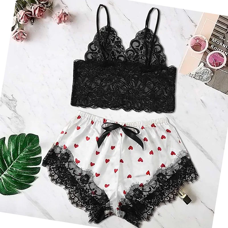 # H30 Женская атласная кружевная сетчатая пижама с принтом сердца, ...