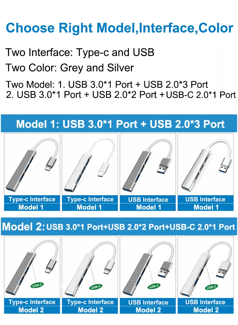 Два интерфейса: Type-c и USBДва цвета: серый и серебристыйДве модели:1. USB 3,0*1 порт + USB 2,0*3 порта2. Порт USB 3,0*1 + порт USB 2,0*2 + порт USB-C 2,0*1