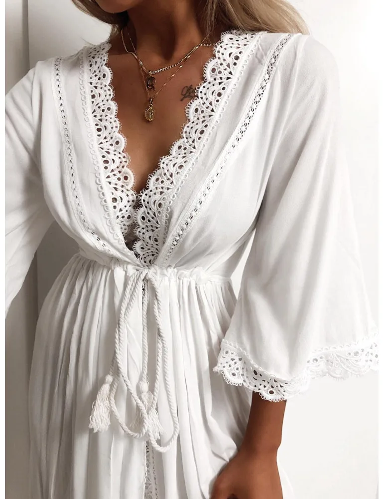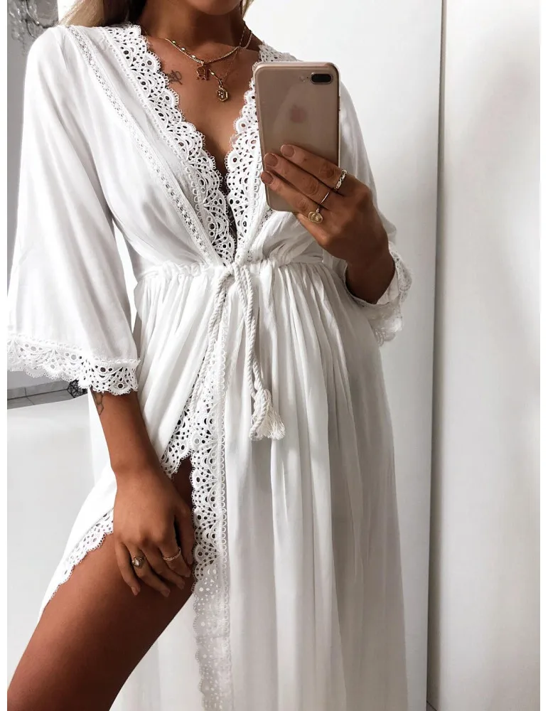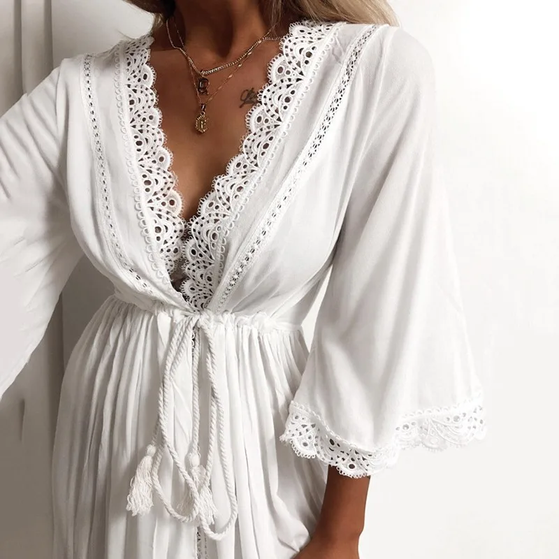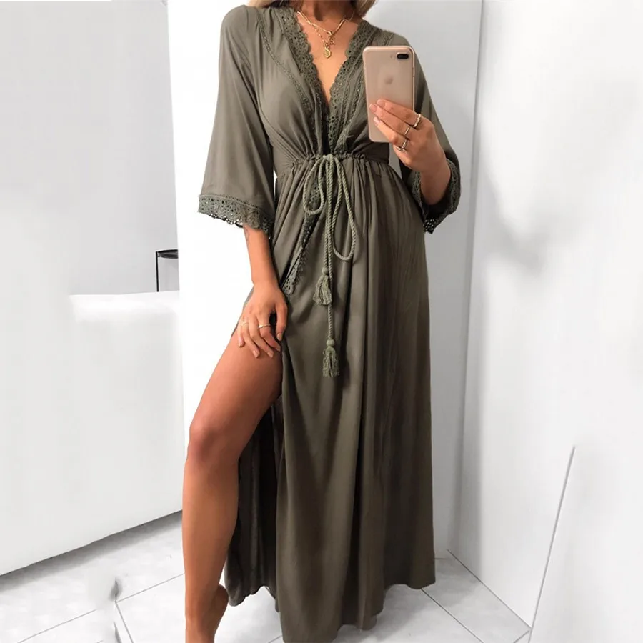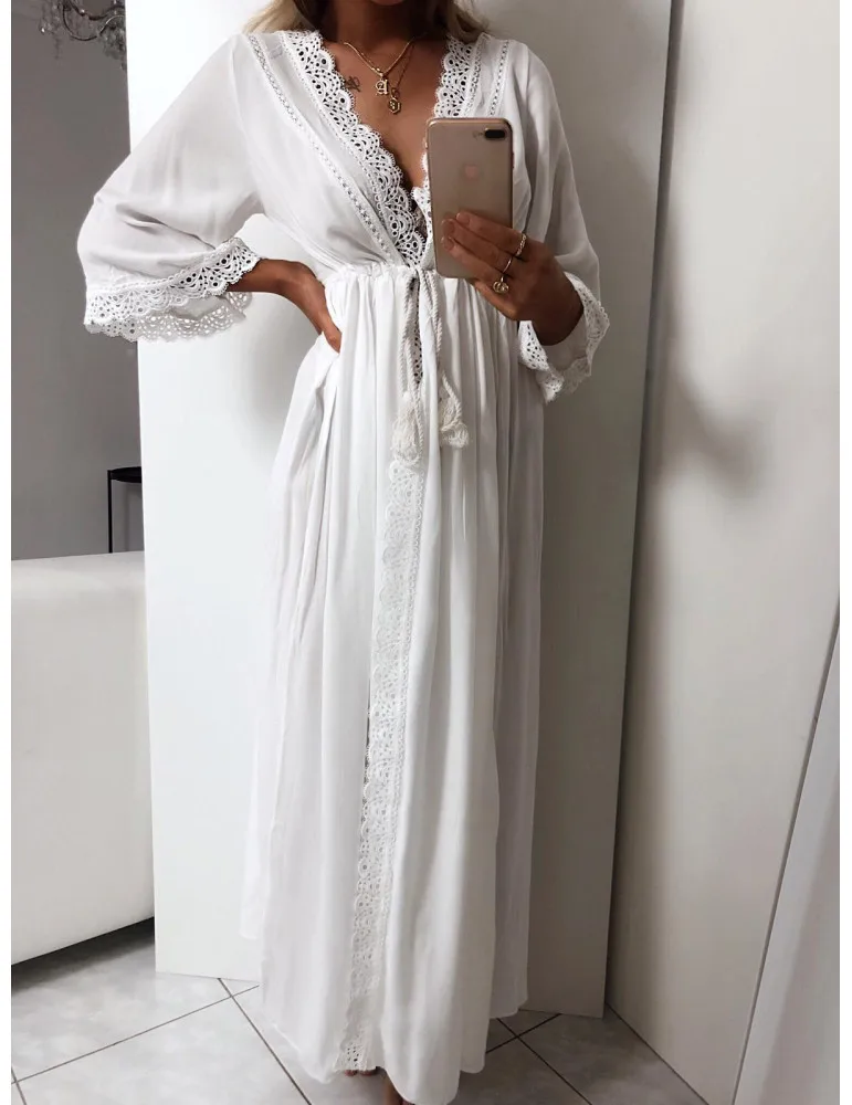 Женское длинное пляжное платье-кардиган, мягкое сексуальное кружевное приталенное повседневное свободное платье макси на лето