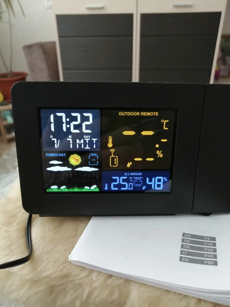 Штучка интересная. Мне понравилась. Наружной датчик определила сразу. Только проблема 24 часа, после на час отстаёт. Но это не так важно в 12 часовом режиме все работает, но может это только у меня. Да и можно подключить до 3х наружных датчиков и установить 15- ти секундный просмотр всех датчиков.