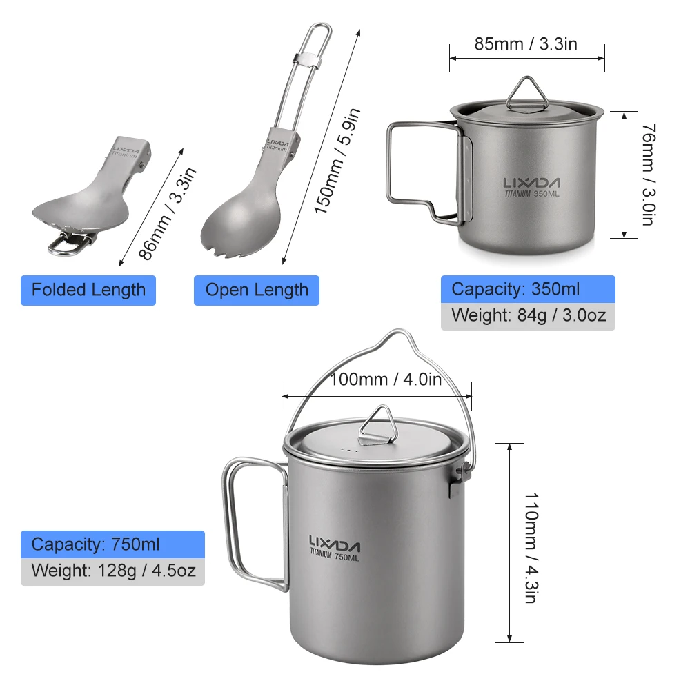Титановая кружка для воды Lixada, кружка с крышкой и ручкой, складная ложка-вилка, для отдыха на открытом воздухе, кемпинга, пикника, посуда