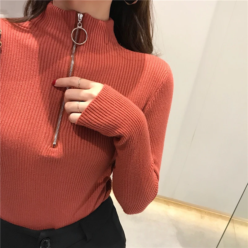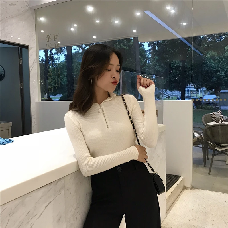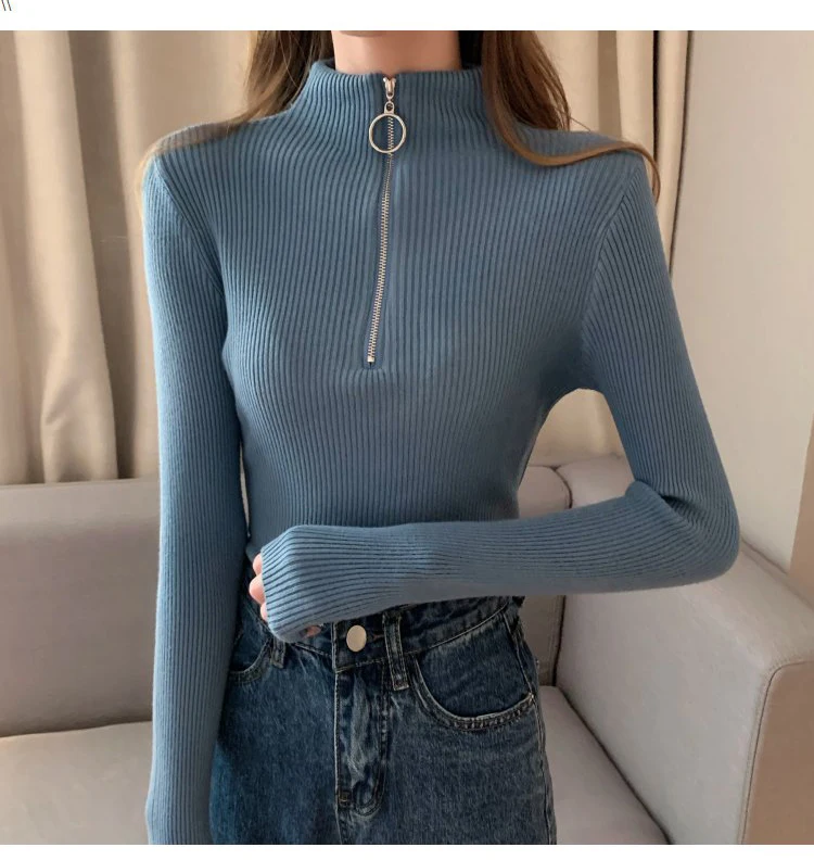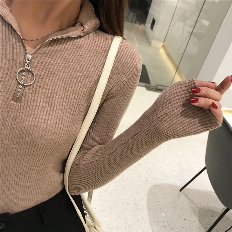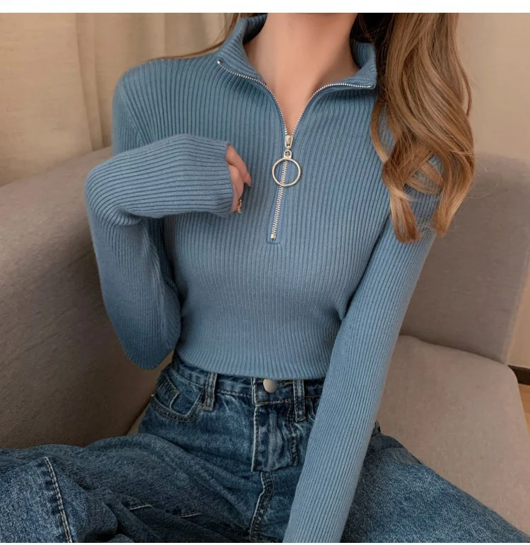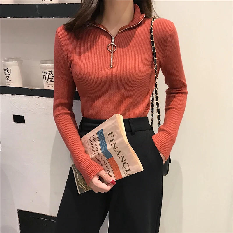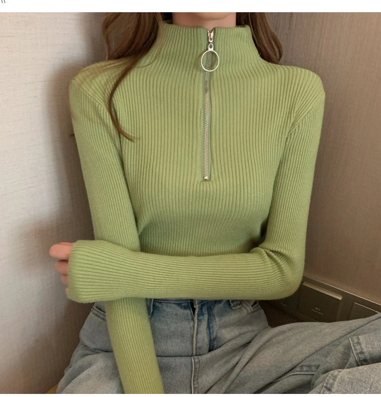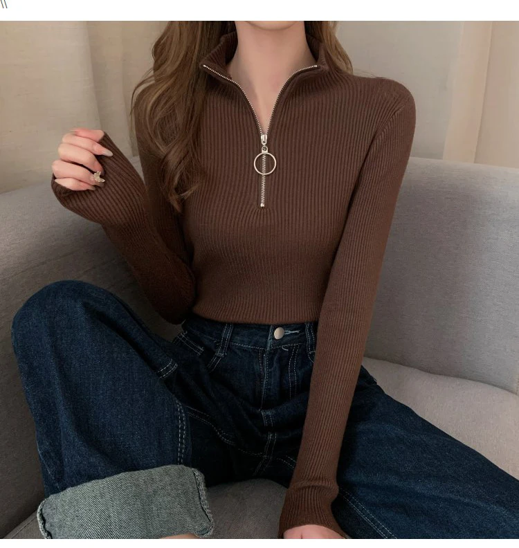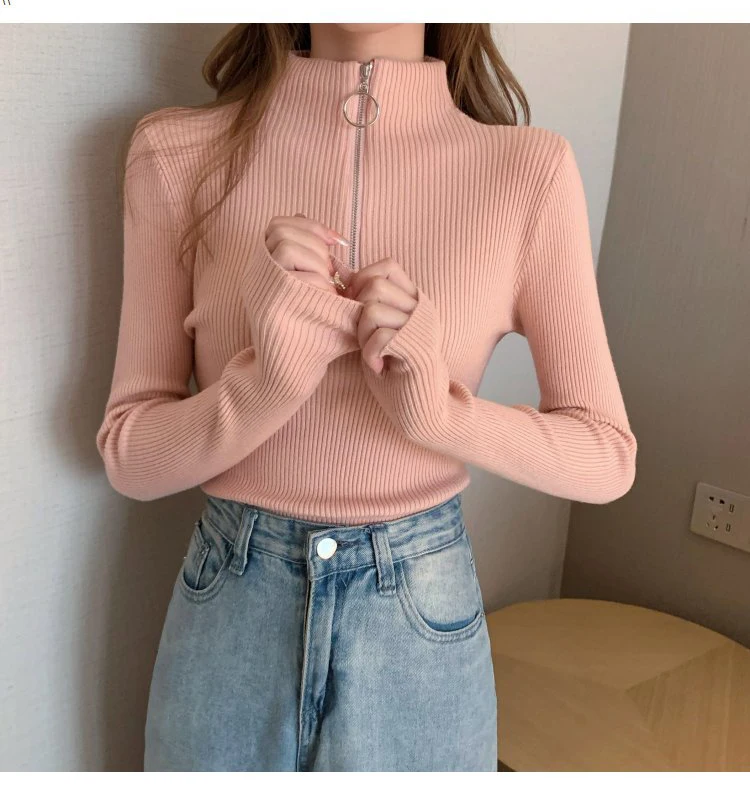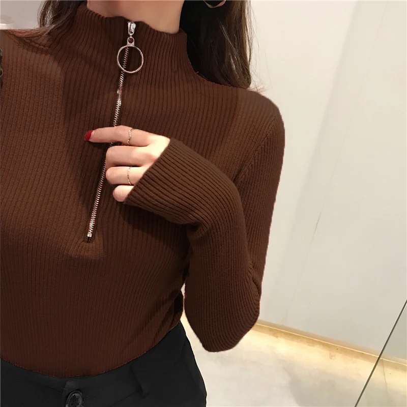 Женский трикотажный свитер на молнии, базовый пуловер с высоким воротом, черного цвета, Осень-зима 2021