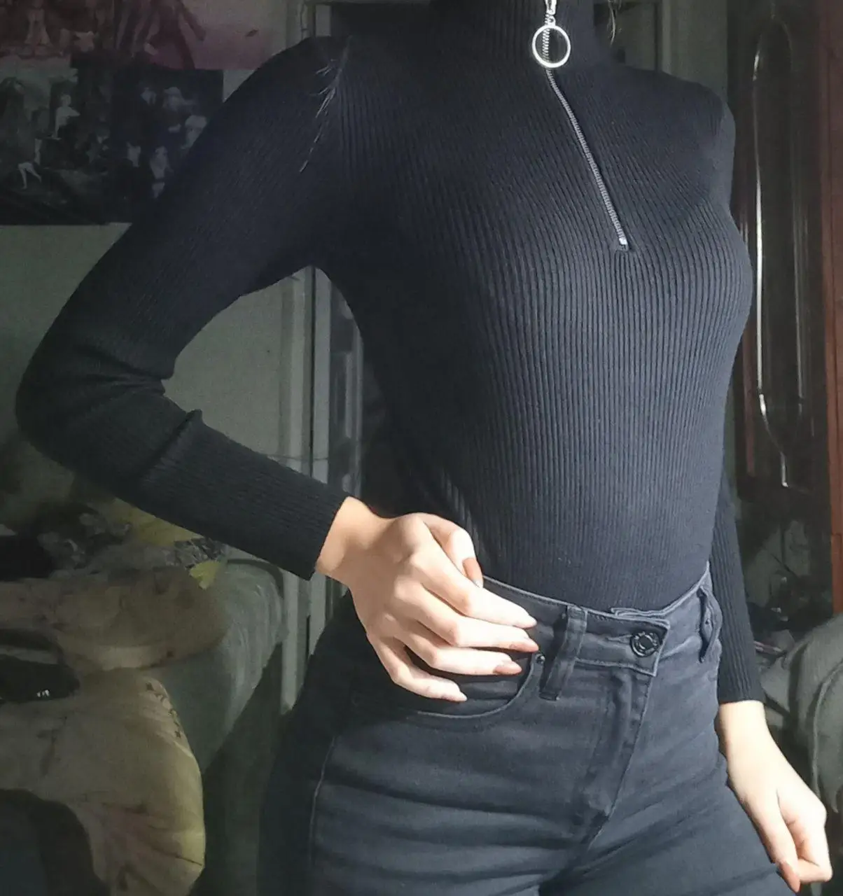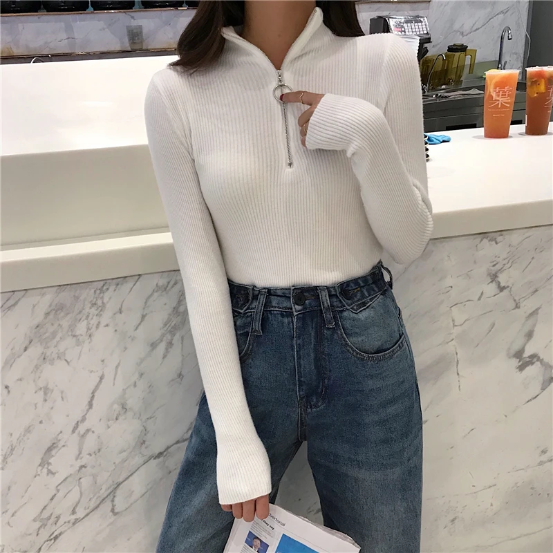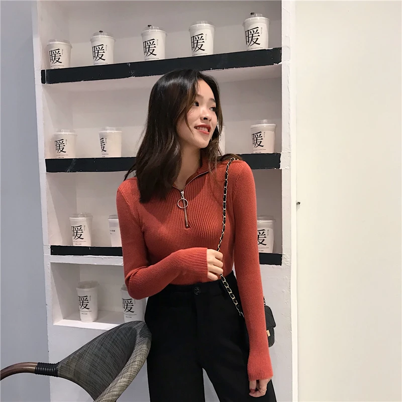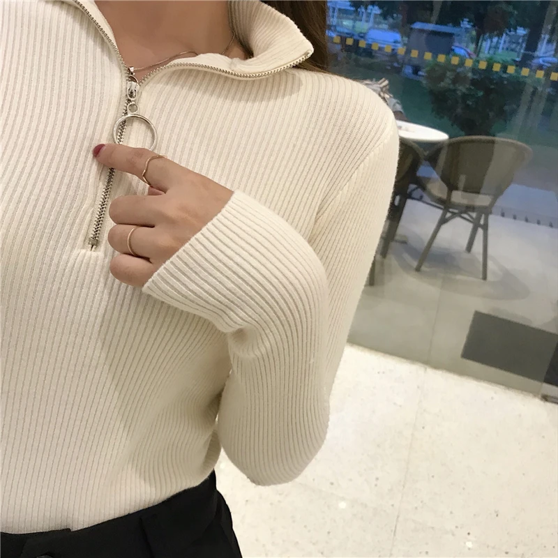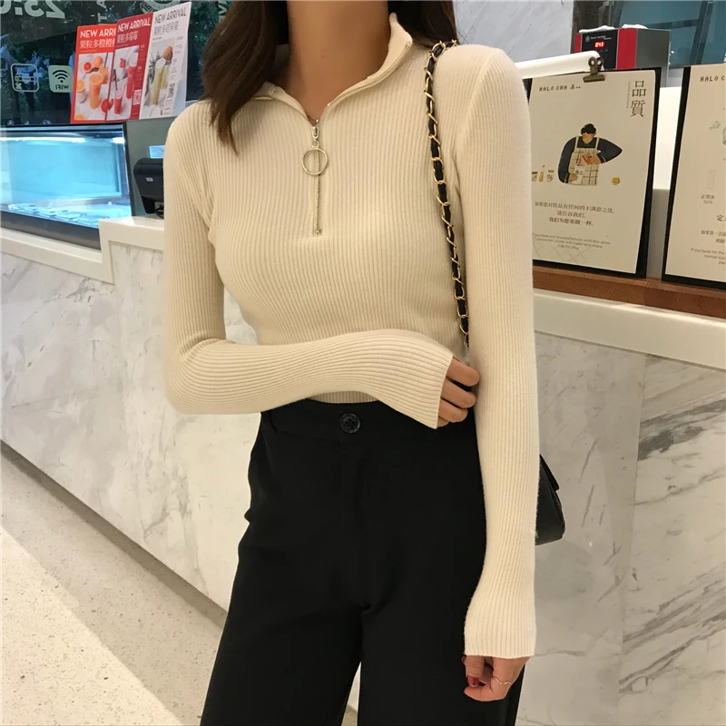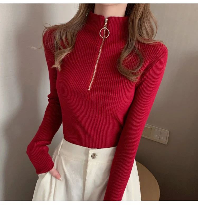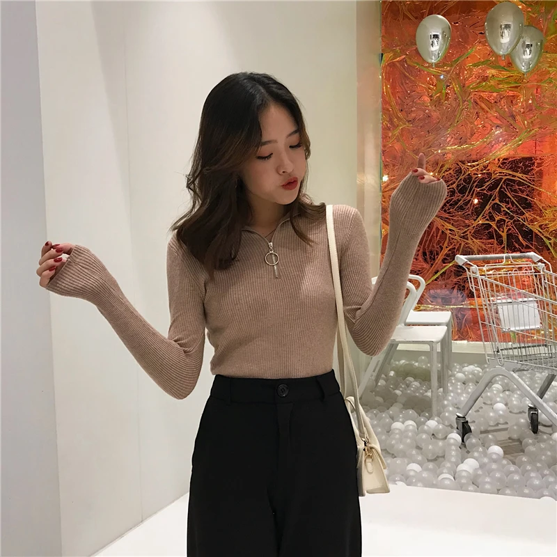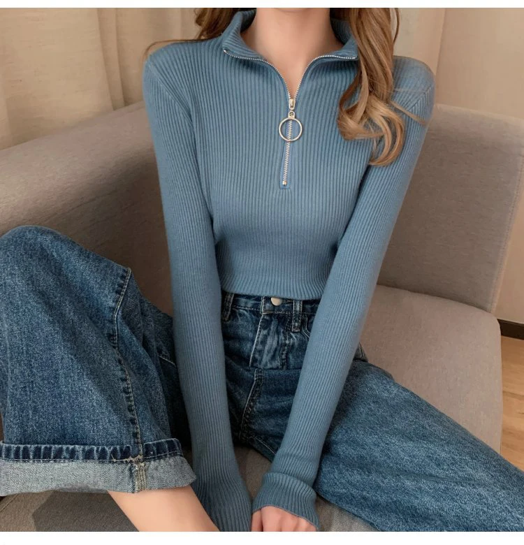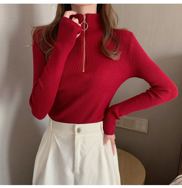 Женский трикотажный свитер на молнии, базовый пуловер с высоким воротом, черного цвета, Осень-зима 2021