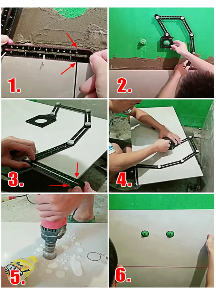 Универсальный шестистворчатый линейка из алюминиевого сплава для керамической плитки, локатор отверстий для грязевой пасты, напольная плитка, инструмент для перфорации стеклянных отверстий.