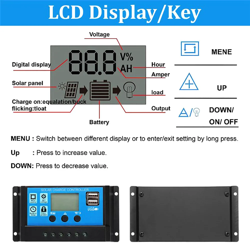 3. Регулятор подходит только для свинцово-кислотных батарей: открытый, AGM, гель (не подходит для никель-металлгидридных, литий-ионных или других батарей).