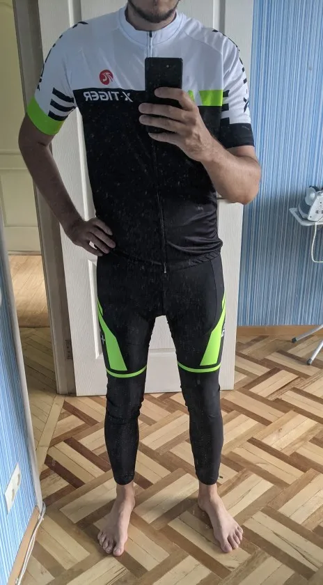 Рост 183, 74 кг - подошло хорошо. На джерси сзади три отдельных кармана, т.е. можно отдельно положить телефон и ключи не бояться, что телефон поцарапается, хотя ключи желательно держать в ключнице - материал можно порвать. Внизу на джерси силиконовая полоска против скольжения. На штанах внизу замки - снимать и надевать их легко. Добротный продукт, купил еще в том же цвете короткий набор в другом магазине и компоную в зависимости от погоды