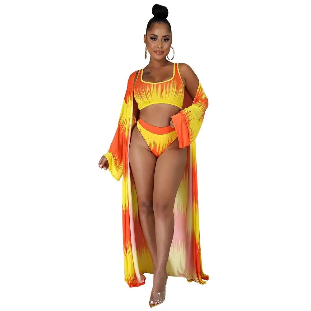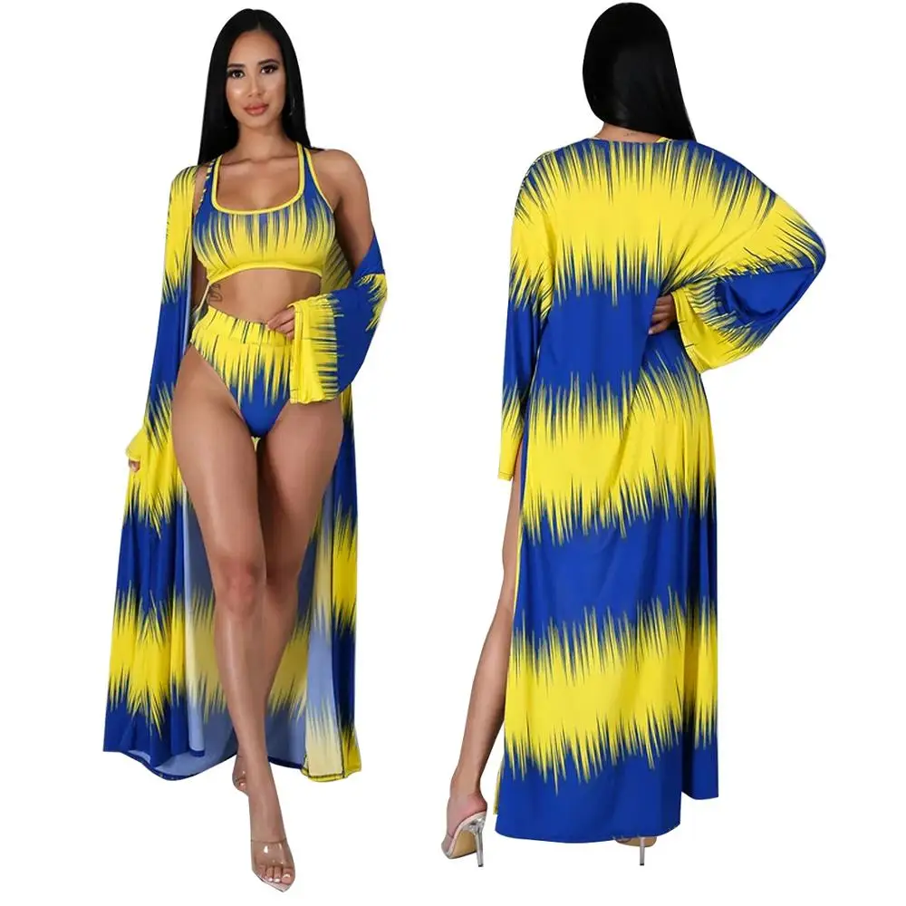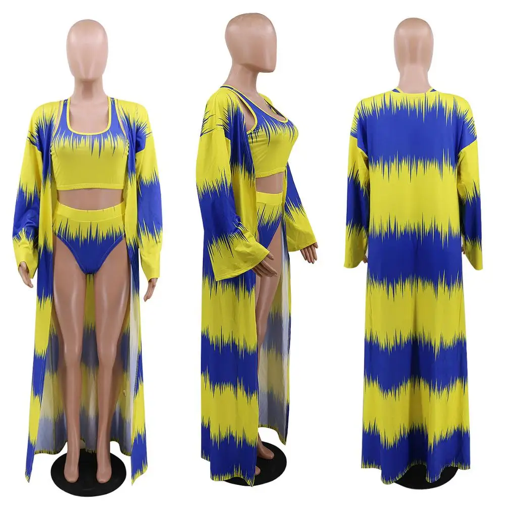 Новинка 2020, комплект из 3 предметов, бикини с высокой талией и принтом + накидка, сексуальный женский купальник, купальный костюм, накидка, комплект, Robe De Plage