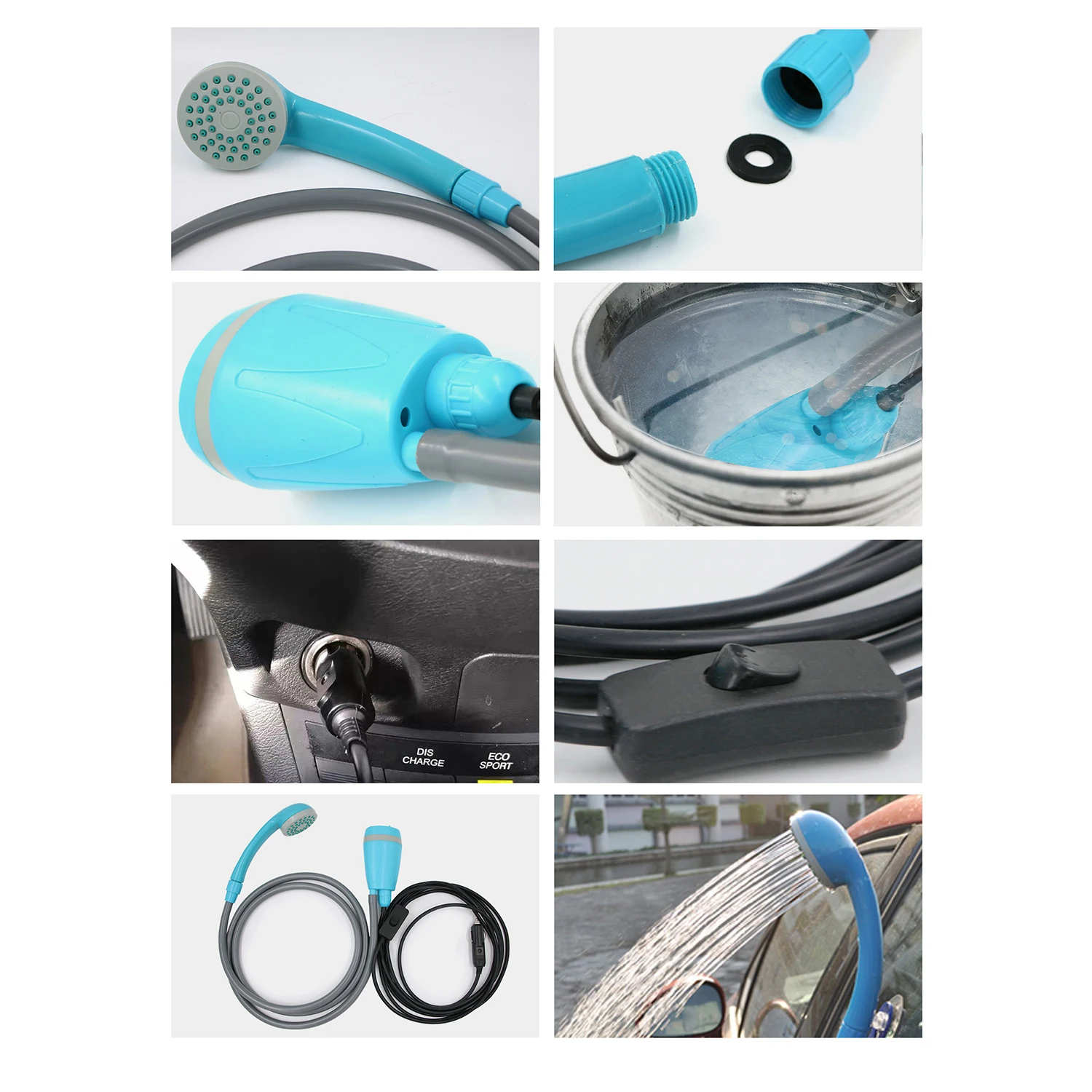 Синяя особенность:Портативный уличный душ преобразует воду из раковины или ведра в устойчивый душ, позволяя наслаждаться комфортным душем на улице.С двумя выходными головками, одной насадкой для душевых кабин и другой насадками для автомоек.С помощью настроек крючка вы можете смело h-ang на макушке и сэкономить силы.Небольшой размер светильник вес и удобство переноски.Широкий спектр применения, подходит для путешествий, пеших прогулок, кемпинга, купания детей, уборки домашних животных, мойки автомобилей, пеших прогулок и т. д.Использовать шаги:1. Подключите насадку для душа (пожалуйста, установите резиновое кольцо, иначе оно протечет воду), и зафиксируйте его в правильном положении с помощью присоски или крючка;2. Подключите водяной насос и водопроводную трубу3. Поместите водяной насос в воду и погружьте водяной насос. (Например, диаметр отверстия горлышка ковша должен быть более 5 см; Температура воды не должна превышать 60 °)4. Подключите вилку питания к автомобильному прикуривателю и убедитесь, что контакт стабильный5. Выключатель питания нельзя поместить в воду. Пожалуйста, поставьте его наружу и включите выключатель питанияВопросы, требующие внимания1. Если водяной насос не помещается в воду, вода не может быть вытянута2. Во время использования водяной насос не должен покидать поверхность воды. Если он покидает поверхность воды, необходимо отключить питание и снова запустить насос, иначе вода не распылится3. При включении выключателя питания распылительную головку следует поместить в плоскую поверхность, чтобы помочь распылить воду.4. После использования остаточную воду в водопроводной трубе водяного насоса необходимо удалить и высушитьСоветы по использованию1. Его нельзя использовать в других целях, кроме стирки и сушки, следствие несет вы сами.2. Храните вдали от источника огня при использовании3. Никогда не используйте на горячей воде, бензине или газе4. Не для медицинского и коммерческого использованияСпецификация:Название продукта: Автомобильный душ с прикуривателем 12 ВВес изделия: 874 гРазмер посылка: 26*27,5*6 смРазмер изделия: водопроводная труба около 2 м, провод около 4 мМатериал изделия: пластикПрименимая модель (сцена): домашний туризм, Самостоятельная поездка, общежитие и т. д.Ток: 3АВходное напряжение: 12 ВВыходное напряжение: 12 ВМощность (Вт): 35 ВтСкорость выхода воды: 5 л/минТемпература воды: не более 45 ℃Посылка: 30,5*28*7 см/12,01*11,02*2,76 дюймаВес посылка: 900 г/31,75 унцииКомплектация:1 * насос1 * Лейка для душа1 * кабель прикуривателя1 * держатель1 * крючок1 * Присоска1 * шланг