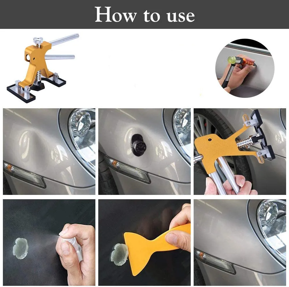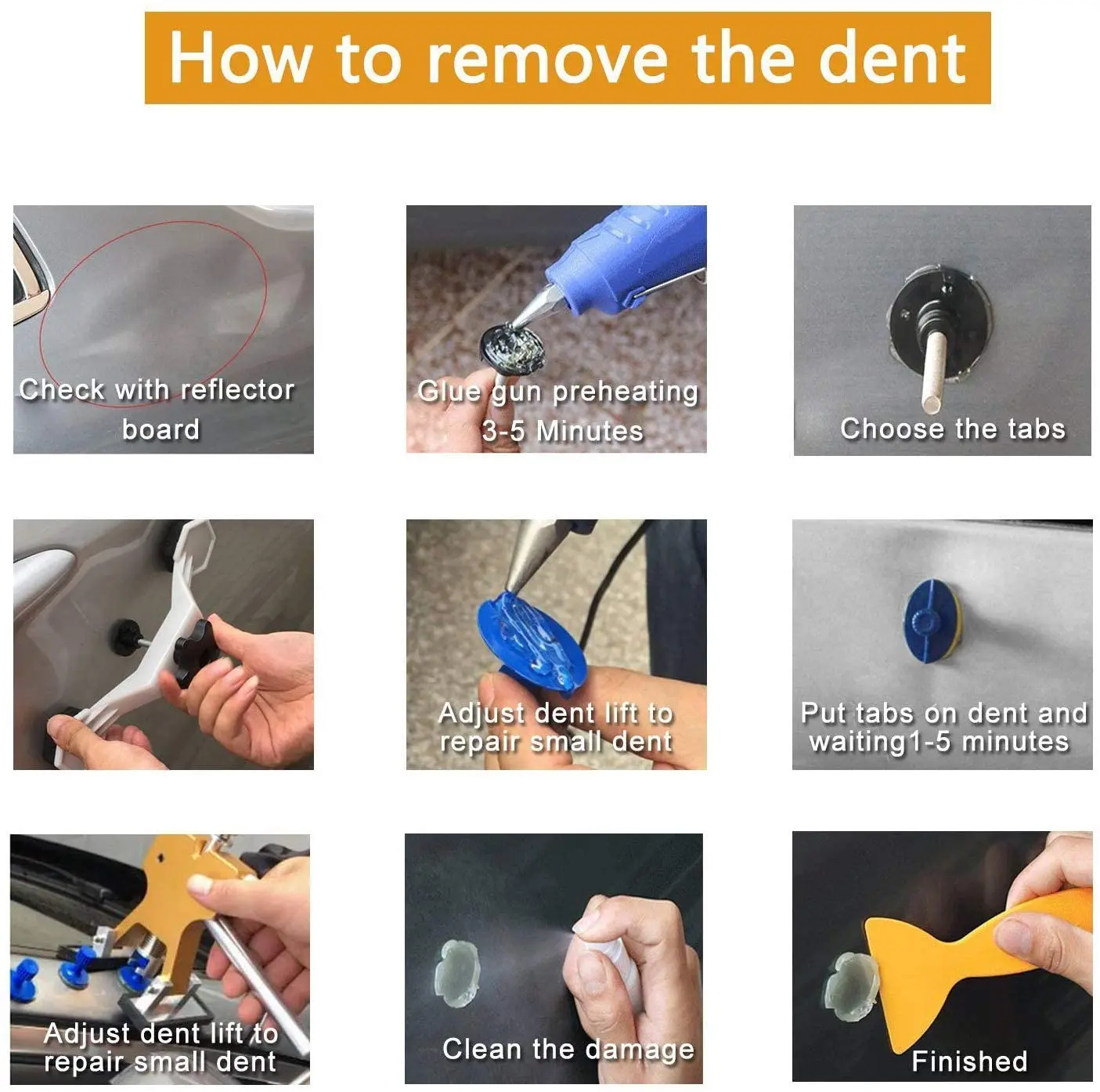1 шт. подъемник вмятин 1 шт нажмите вниз молоток 1 шт. молоток для удаления вмятин 1 шт. ручка с 5 головками 1 шт. клеевой пистолет 5 шт клеевых палочек 37 шт клей вкладки 1 шт. желтый скребок 1 шт. салфетка для посуды 1 шт. пустая Алкогольная бутылка 1 шт прокладка