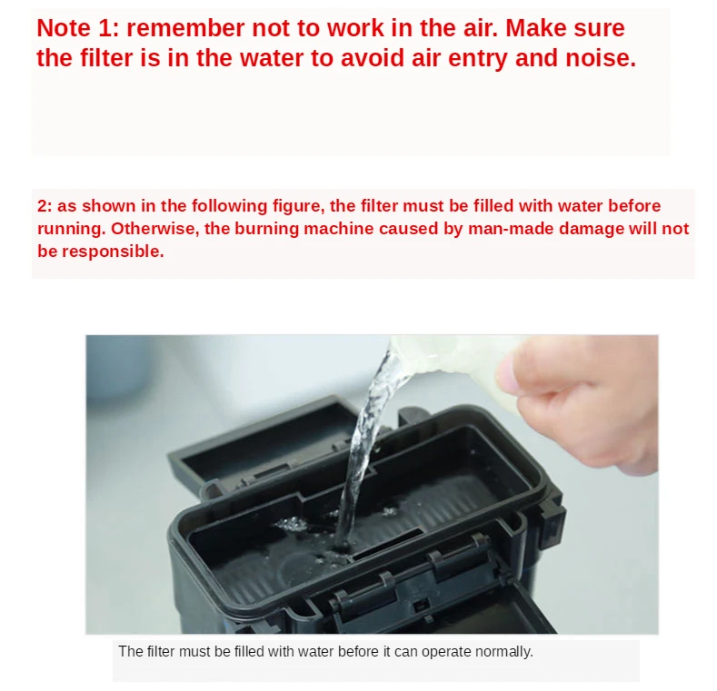 Примечание 2: не забывайте работать в воздухе. Убедитесь, что фильтр находится в воде, чтобы избежать попадания воздуха и шума.