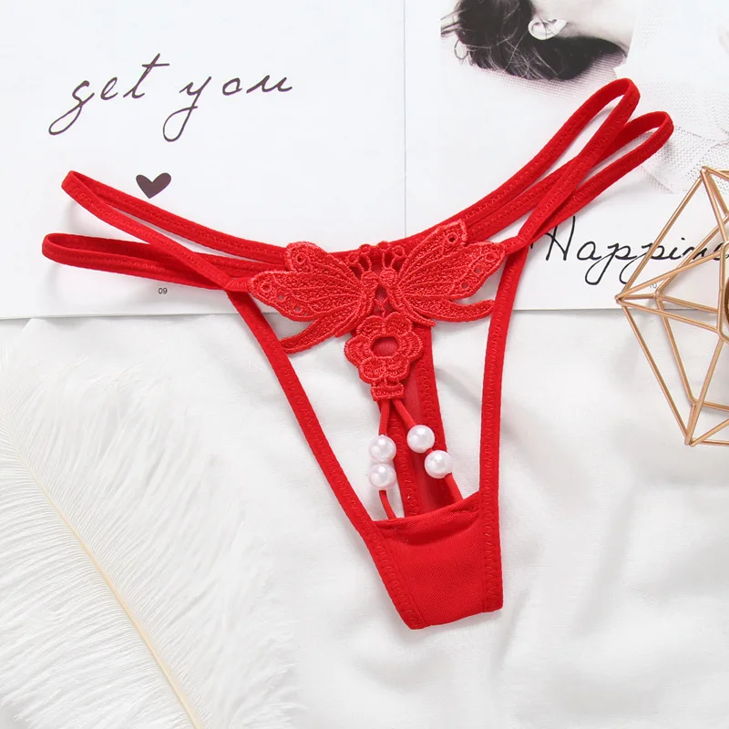 Стринги женские, с вышивкой, с низкой талией, нижнее белье с жемчугом