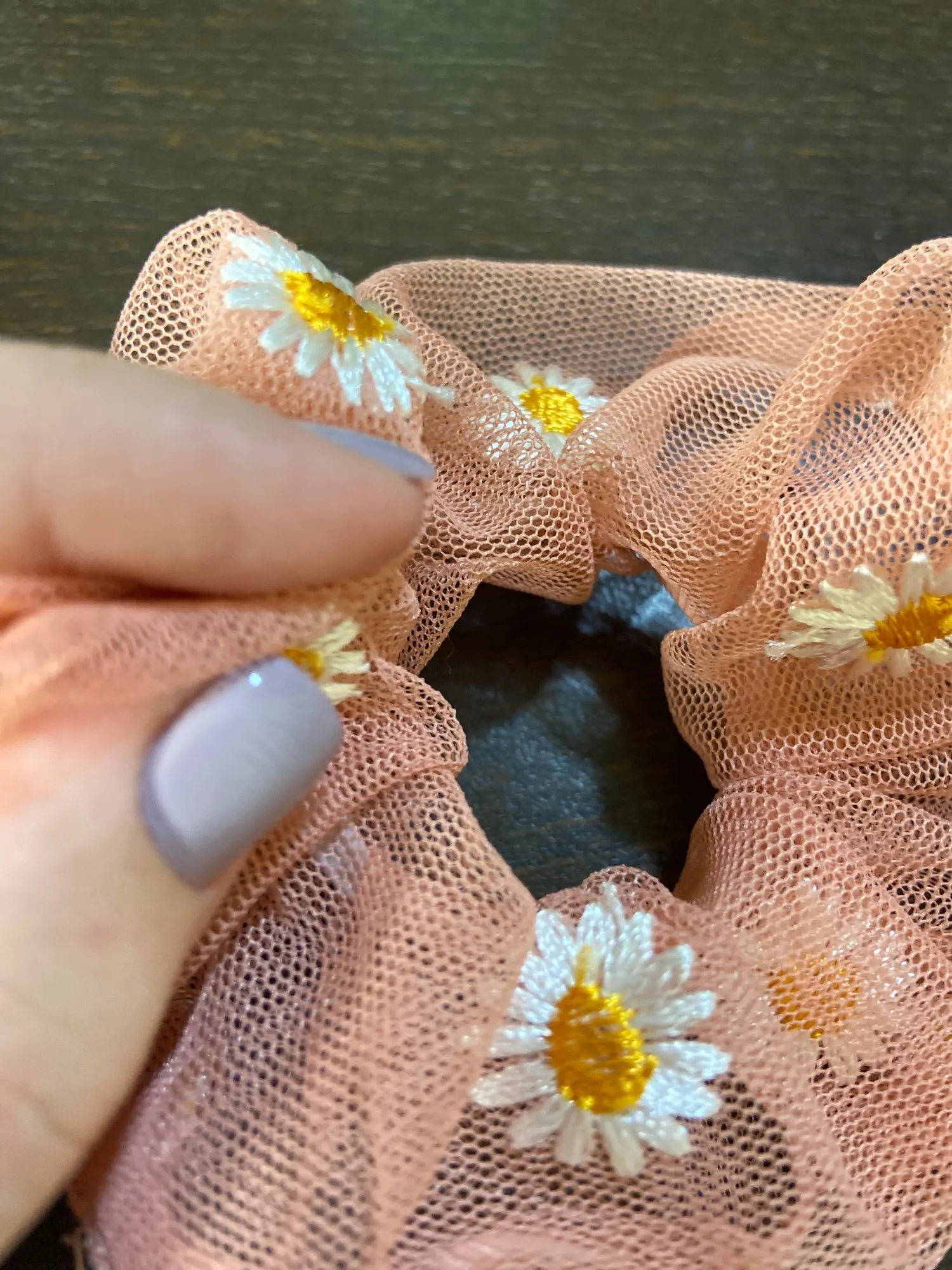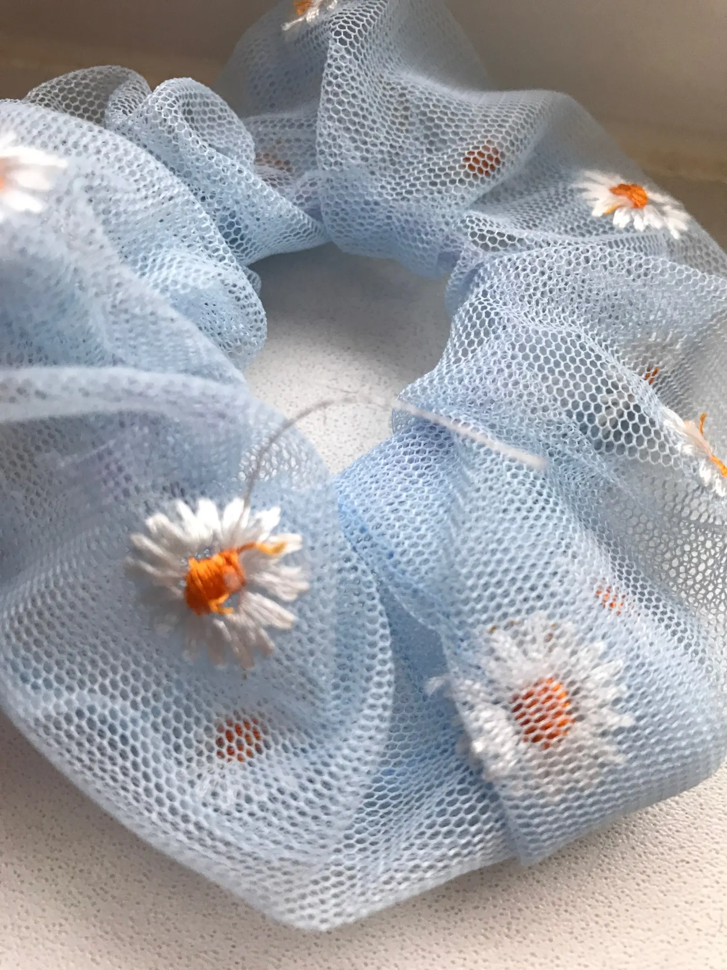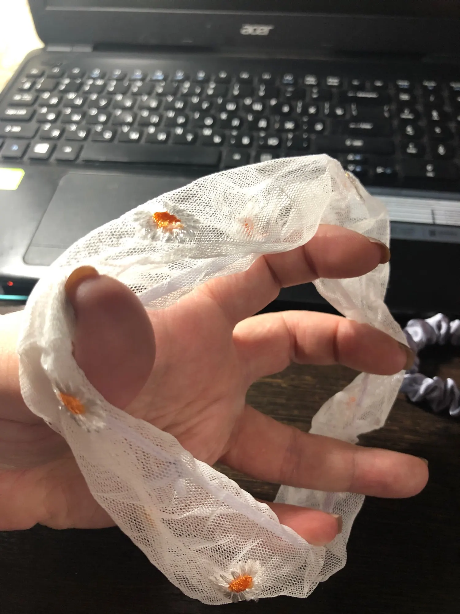 Хорошая резинка для волос, материал сеточка, есть небольшие погрешности в вышивке, но это не проблема, тем более за такие копейки