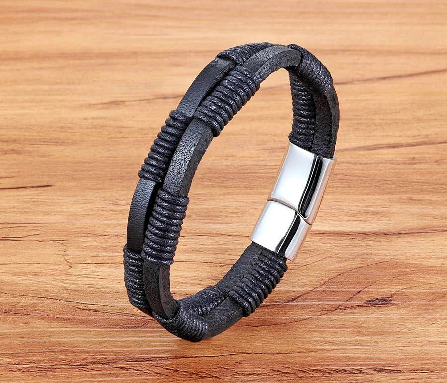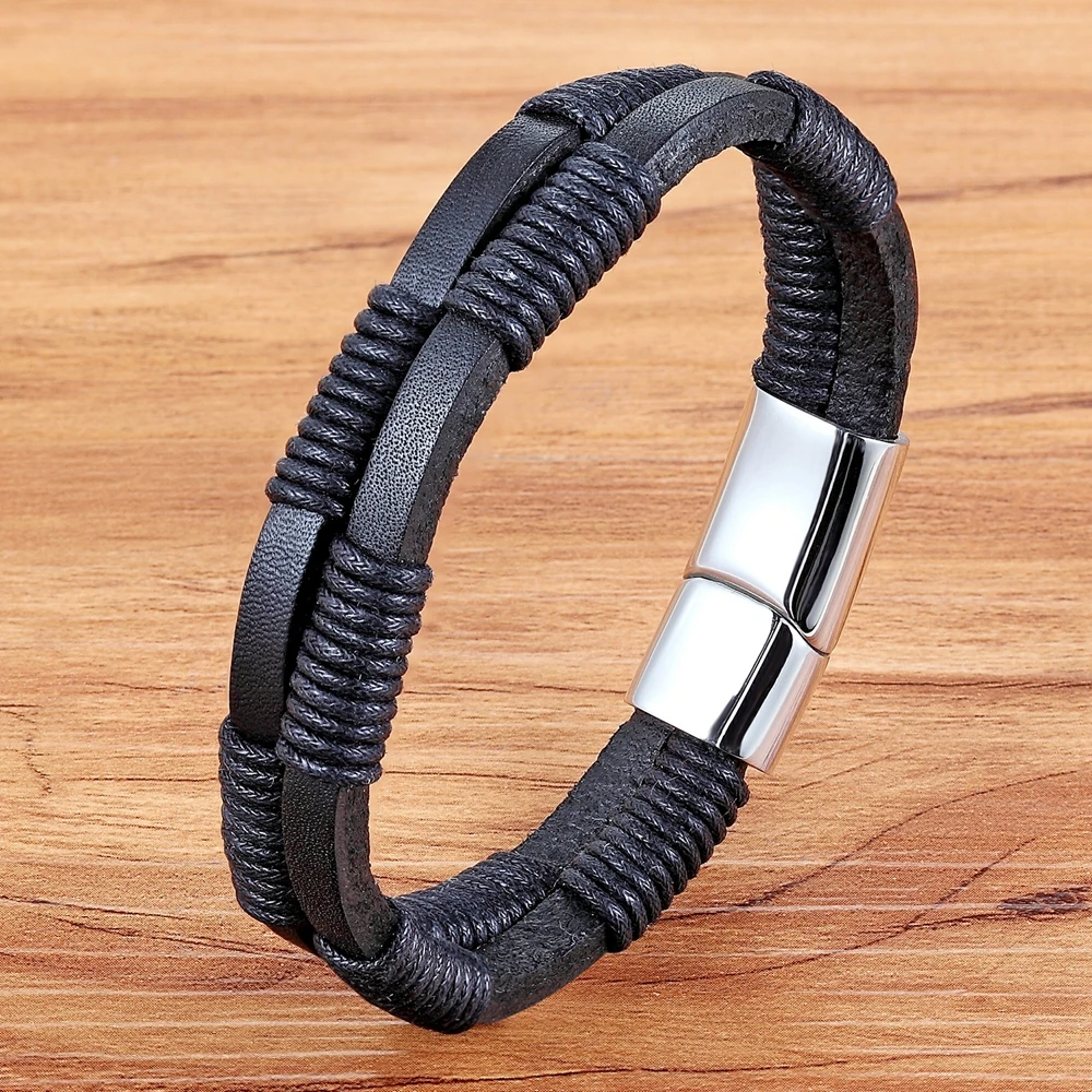 Классический многослойный мужской кожаный браслет из нержавеющей ст...