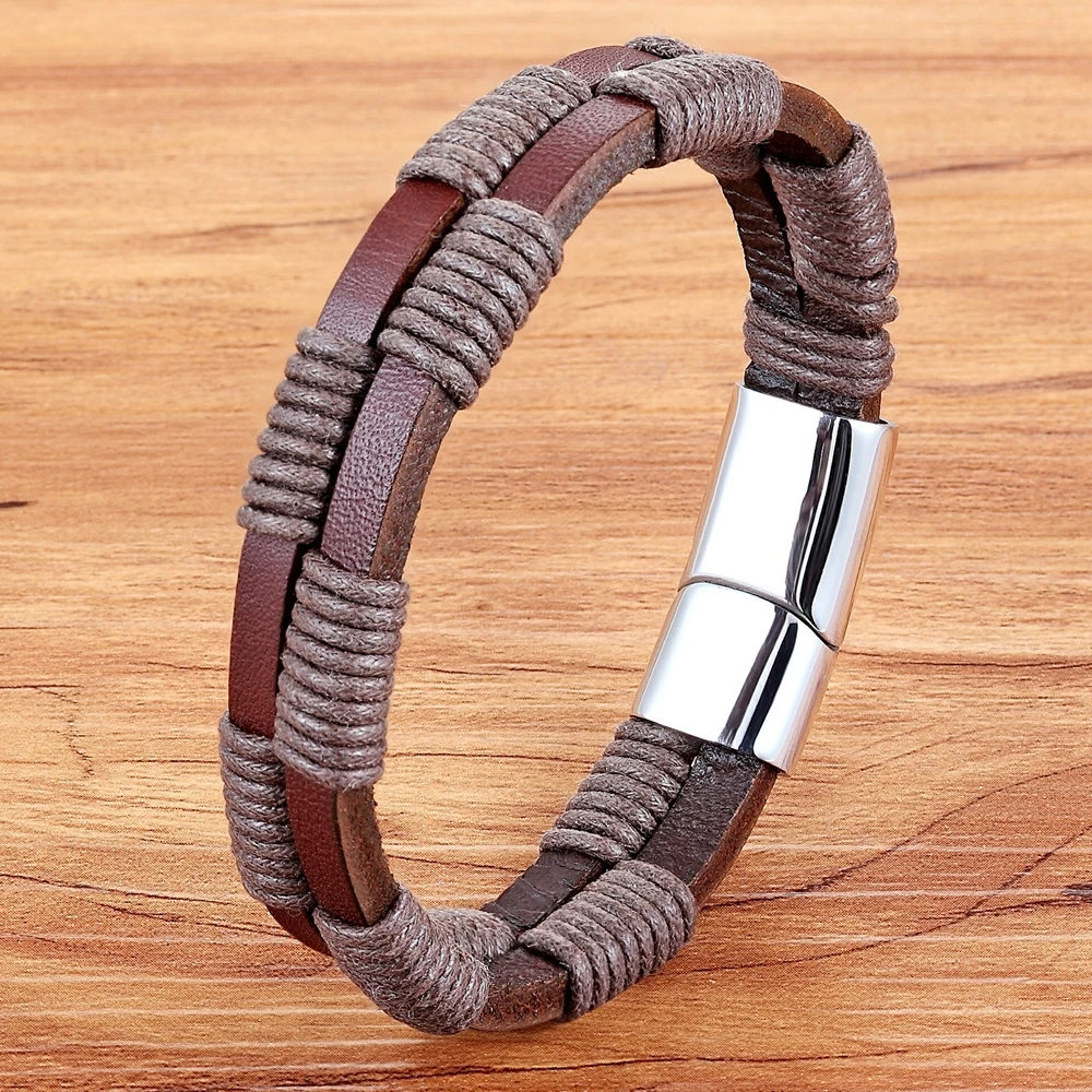 Браслет мужской из кожи и нержавеющей стали, многослойный ювелирный...
