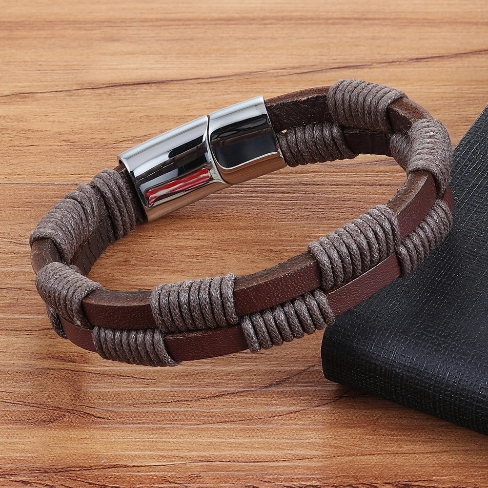 Мужской браслет из нержавеющей стали, многослойный кожаный браслет,...