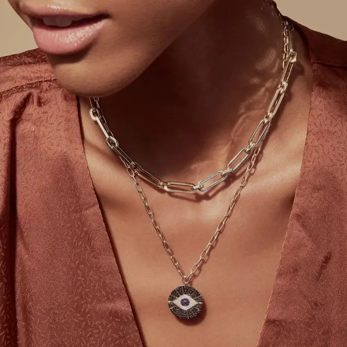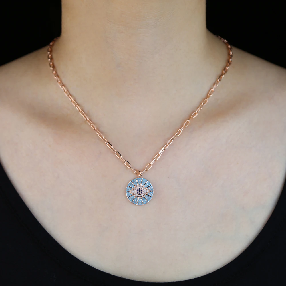 Женское Ожерелье с круглой подвеской, с черным кубическим цирконием, вымощенным геометрическим рисунком, голубой бирюзовый, цепочка с открытыми звеньями, Турецкий Дурной глаз