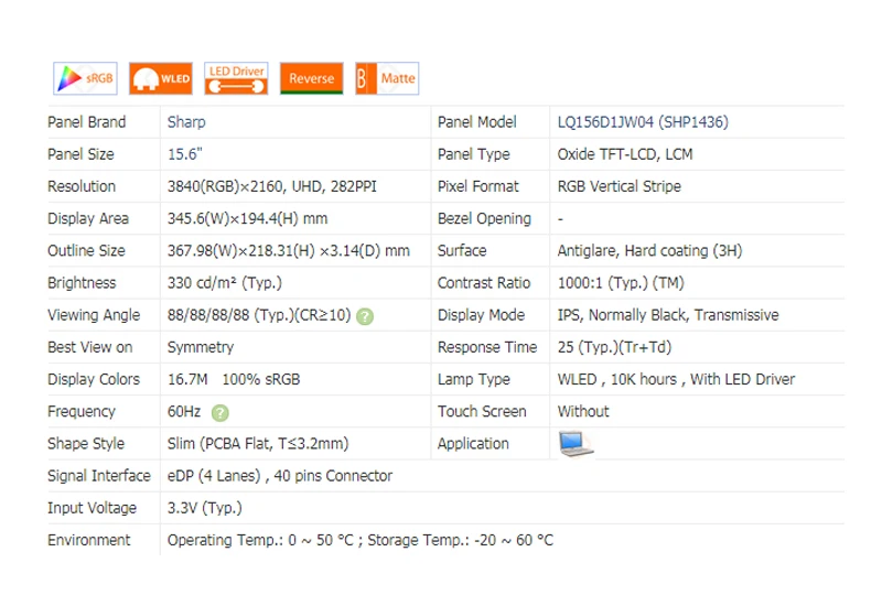 LQ156D1JW04 матовая матрица 3840(RGB) 2160 UHD 100% sRGB цвет IPS нормально черная панель 40pin 15,6 "ноутбук ЖК WLED для Sharp бренд