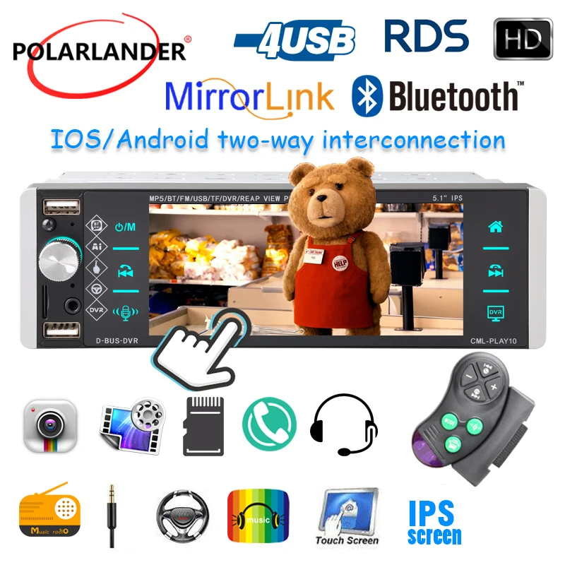 Автомобильный плеер 1Din Mp5, сенсорный автомобильный радиоприемник, двунаправленное подключение, RDS, AM, FM, 4-USB, 5,1 дюйма, Поддержка Android 10, Mirrorlink, Bluetooth
