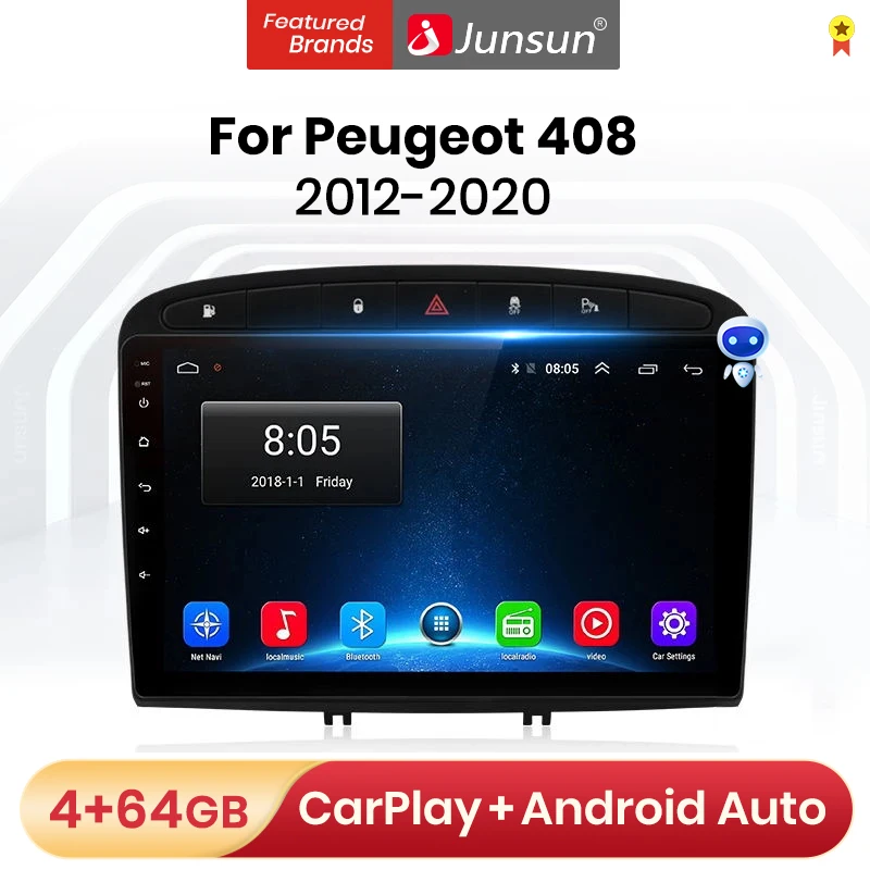 Магнитола Junsun V1 Pro, мультимедийный проигрыватель с 4G радио и GPS, на Android 9,0, 4 Гб ОЗУ, 64 Гб ПЗУ, для Peugeot 408, 308, 308S, 2012 -2020, типоразмер 2DIN