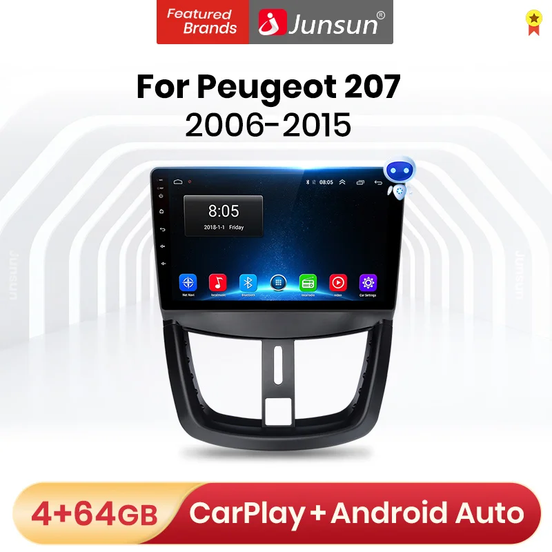Мультимедийная магнитола Junsun V1 Pro для PEUGEOT, стерео-система на Android 9,0, 4 Гб ОЗУ, 64 Гб ПЗУ, с GPS Навигатором, видеоплеером, без DVD, для PEUGEOT 207, 2006-2015, типоразмер 2DIN