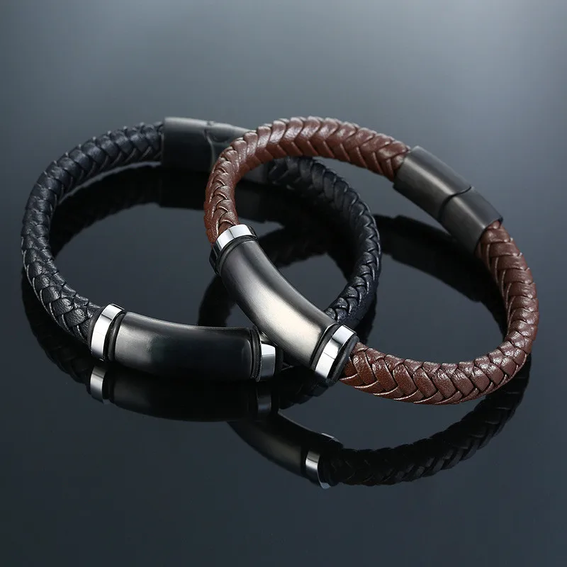 Браслет кожаный мужской, Плетеный, черного цвета, из нержавеющей стали