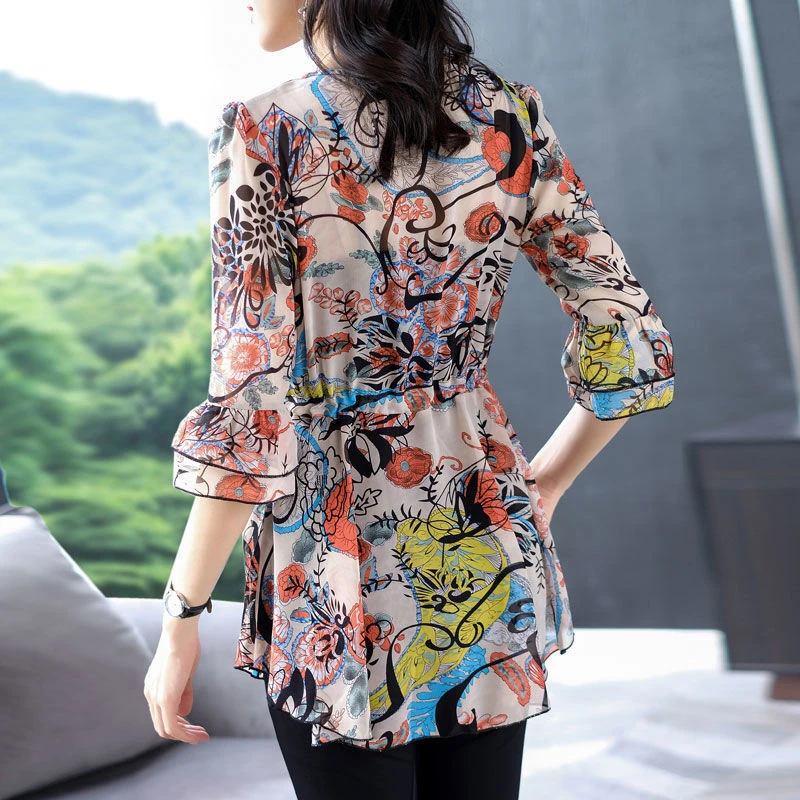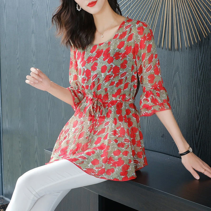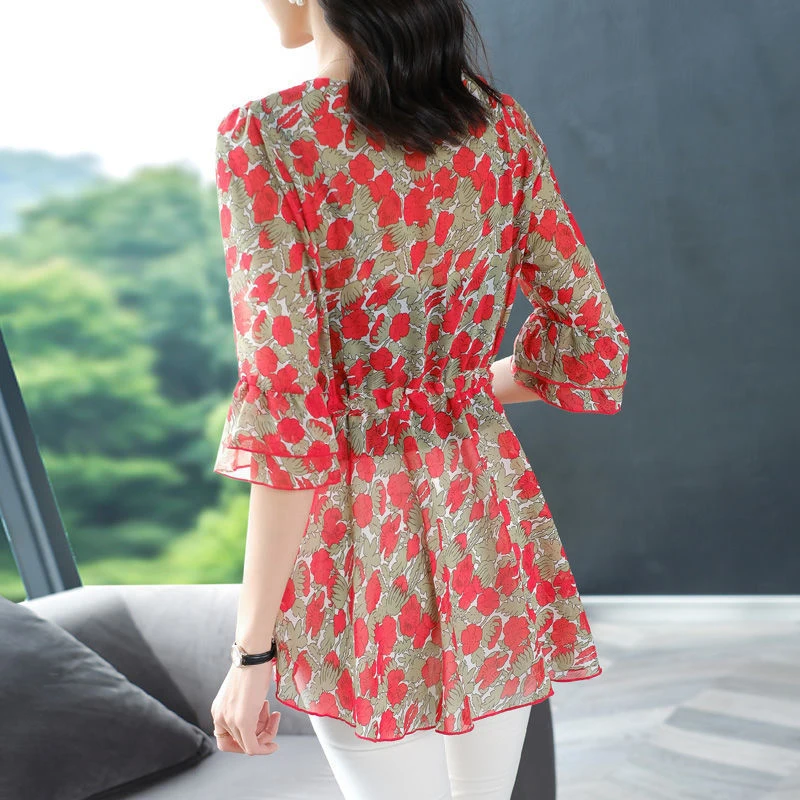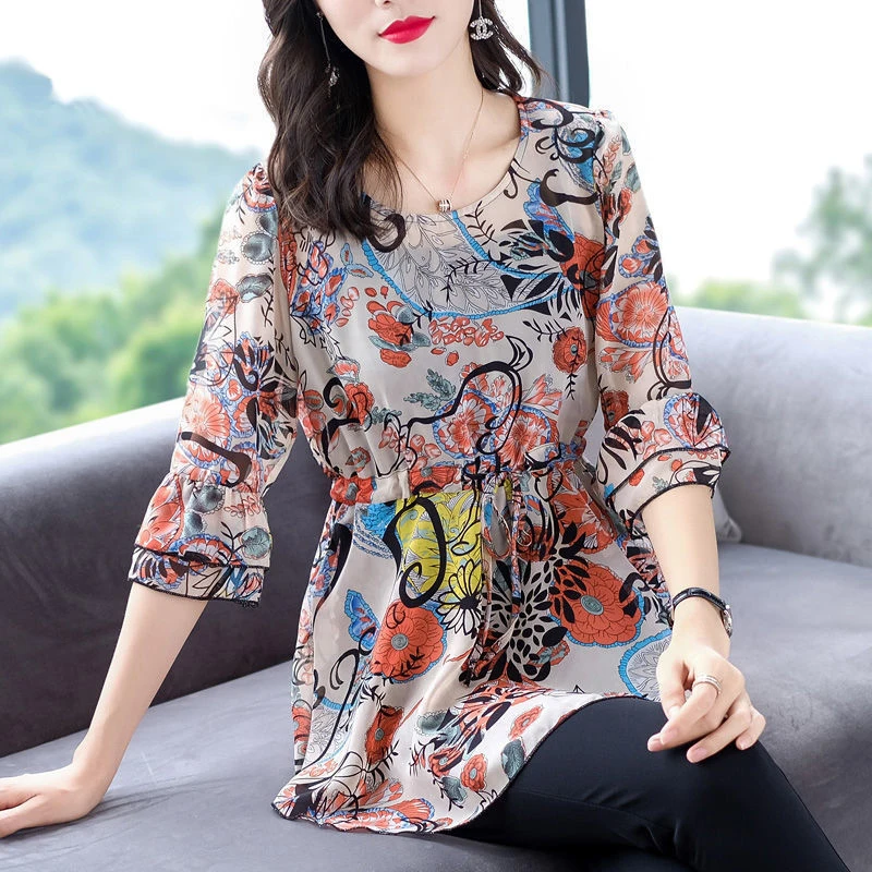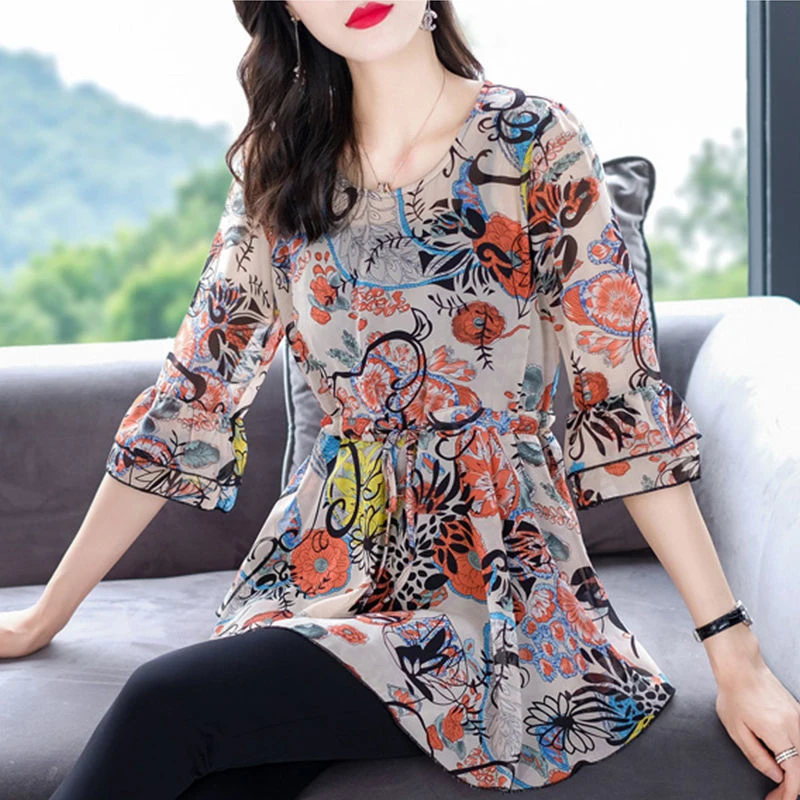 Блузка женская летняя, с круглым вырезом и цветочным принтом